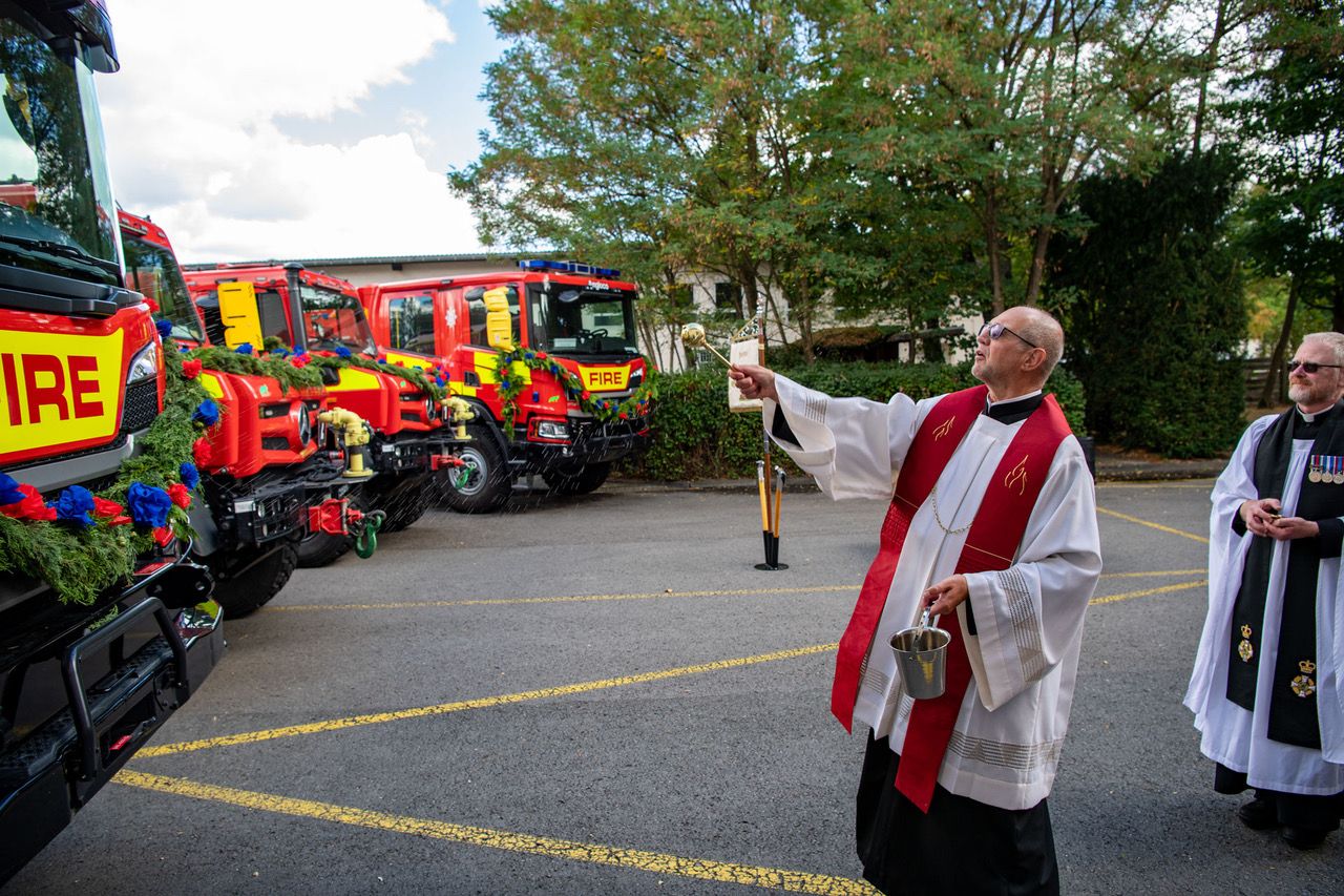 Unter der Begleitung des Musikzuges Schloß Neuhaus der Feuerwehr Paderborn und vor geladenen Gästen, Kameraden, Familien und Freunden wurden die vier neuen Fahrzeuge von Militärseelsorger Nick Adley und Pfarrer Peter Scheiwe gesegnet. Der neue Fuhrpark besteht nun aus zwei Waldbrandlöschfahrzeugen vom Typ Unimog mit einer Löschwasserkapazität von jeweils 4.000 Litern, einer schweren Seilwinde und Wasserwerfer an der Front der Fahrzeuge, welche aus der Kabine heraus gesteuert werden können. Weiterhin sind auch zwei neue, geländegängige Tanklöschfahrzeuge im Einsatz mit jeweils 2.000 Litern Wasser im Tank.