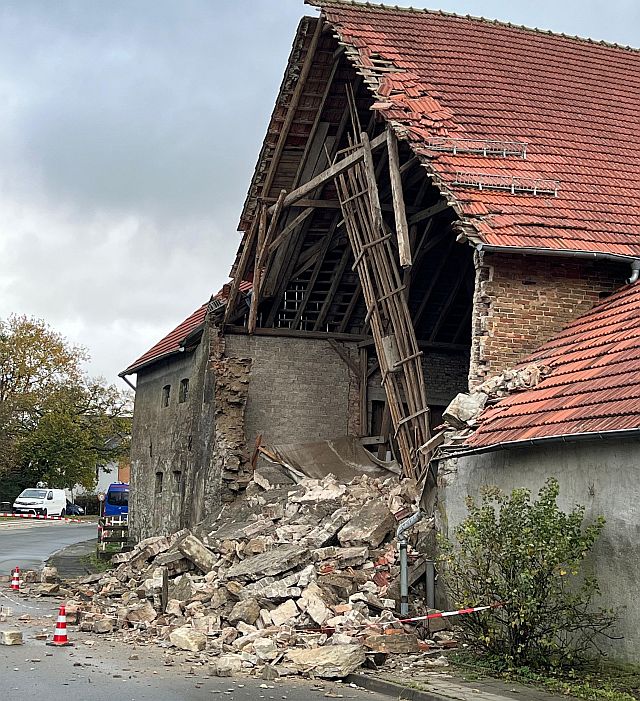 Borchen. Verletzt wurde dabei niemand. Da weitere Teile der Wand immer wieder herabfielen sperrten wir die Ebbinghauser Straße nach Rücksprache mit der Polizei vollständig ab. Um die weitere Gefahr für einen gesamten Einsturz des Gebäudes abschätzen zu können, forderten wir über das THW Paderborn zwei Baufachberater an. Das Ordnungsamt der Gemeinde Borchen wurde ebenfalls benachrichtigt. Die THW-Fachberater bestätigte uns im Verlauf eine akute Einsturzgefahr die gesamte Giebelwand. Die Gefahr für einen Gesamteinsturz der Scheune sei jedoch gering.