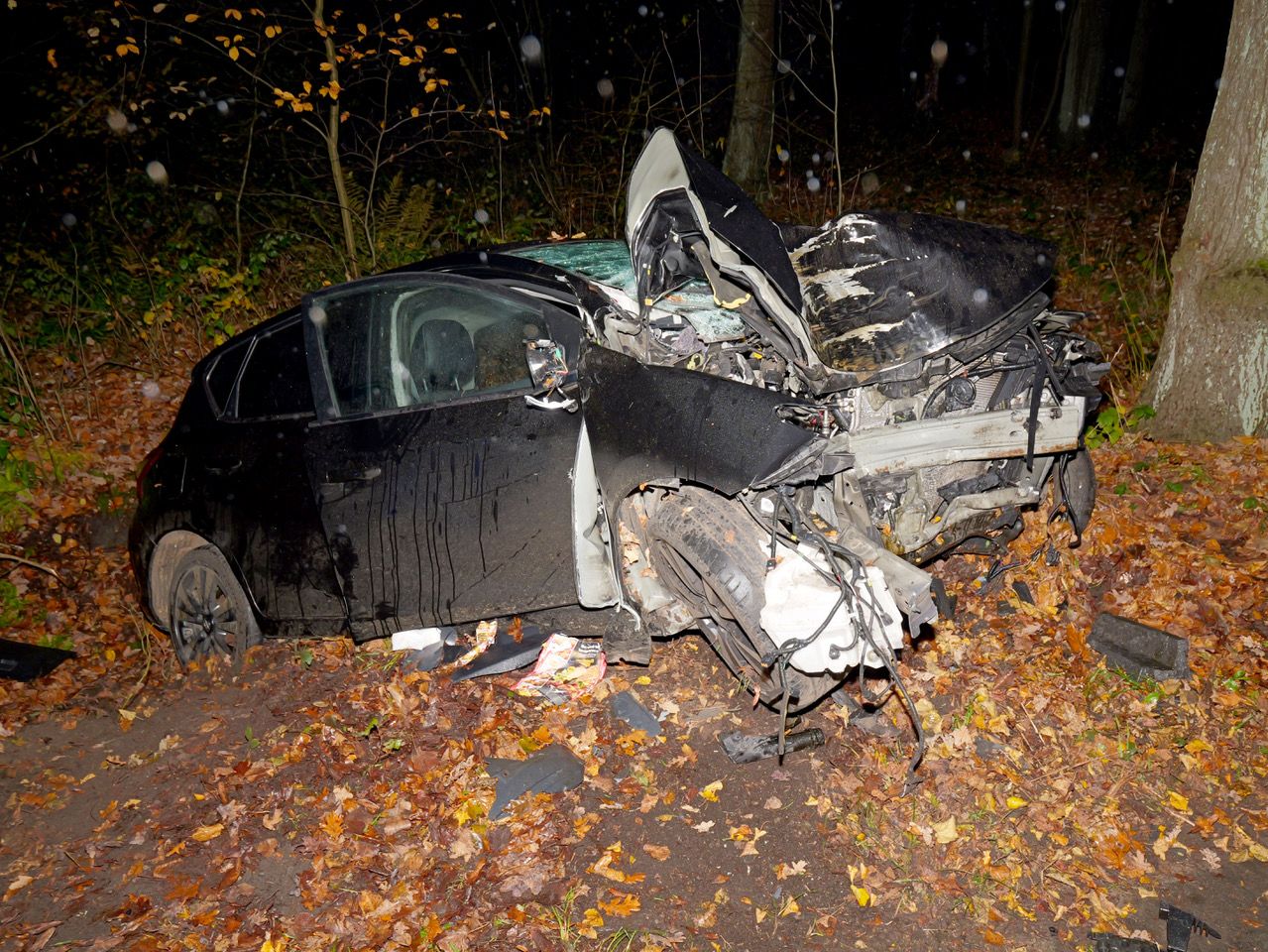 Paderborn-Sande. Der Unfall ereignete sich nach Auskunft der Polizei gegen 3.55 Uhr, als ein mit zwei Personen besetzter schwarzer Nissan Pulsar auf der Klausheider Straße in Fahrtrichtung Sande nach rechts von der Fahrbahn abkam und frontal gegen einen Straßenbaum prallte. Durch die Wucht des Anpralls drehte sich der im Frontbereich stark deformierte Wagen und wurde in den gegenüberliegenden Straßengraben geschleudert. Beide Insassen konnten sich trotz schwerer Verletzungen aus eigener Kraft aus dem Wrack befreien.