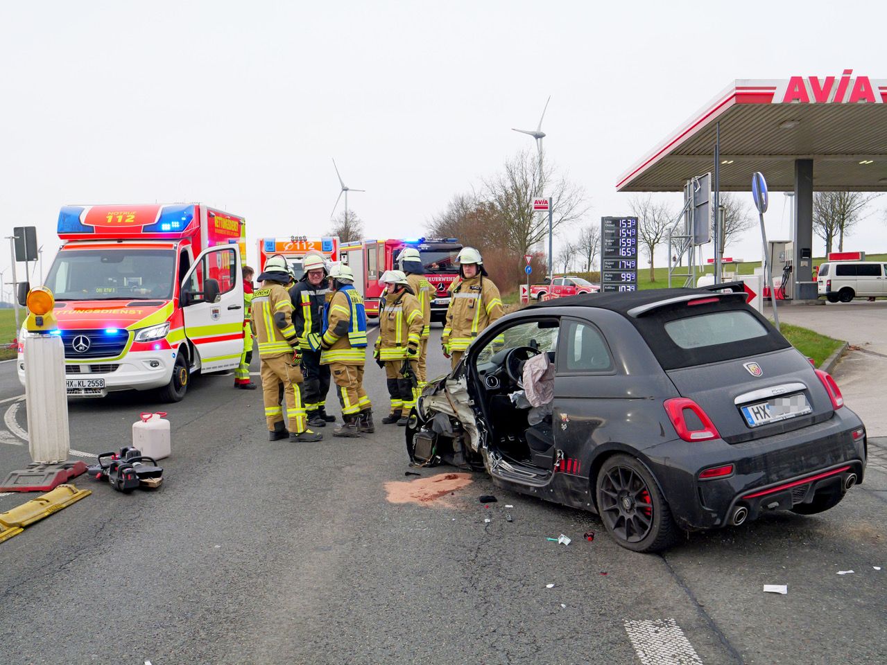 Durch den Anprall schleuderte der Fiat zunächst gegen ein mit drei Frauen besetzten Ford Ecosport aus dem Kreis Paderborn, drehte sich und blieb dann entgegen der Fahrtrichtung in der Tankstellenzufahrt liegen. Das abgerissene Rad des Fiats blieb in Fahrbahnmitte in einem Trümmerfeld liegen.