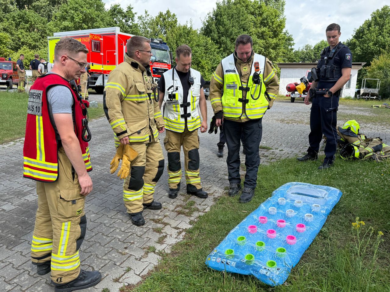 Zahlreiche Kräfte von Polizei und Feuerwehr suchten am Donnerstagvormittag nach einer vermissten Person auf dem Lippesee. Personen hatten eine Luftwassermatratze gemeldet, die führerlos auf dem der Wasseroberfläche trieb. Nachdem bereits die Polizei mit mehreren Streifenwagen den gesamten Uferbereich abgesucht hatte, alarmierte die Leitstelle des Kreises um 10.10 Uhr unter dem Stichwort „Person im Wasser“ die Feuerwehr Paderborn, die umgehend mit rund 30 Feuerwehrleuten und dem Rettungsdienst zum Lippesee ausrückte, berichtet Eisatzleiter Johannes Mollemeier.