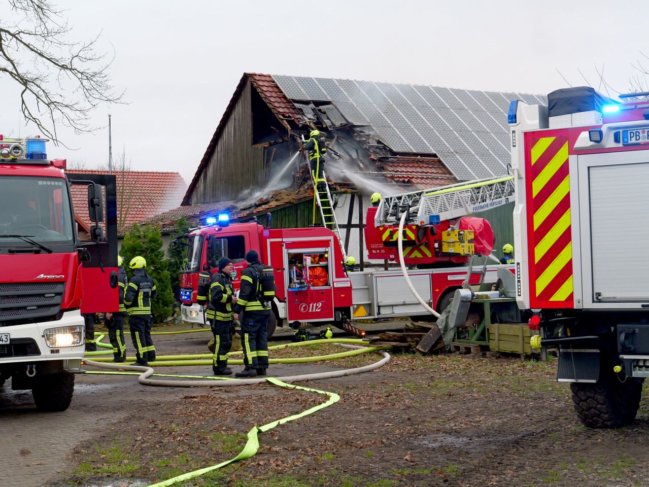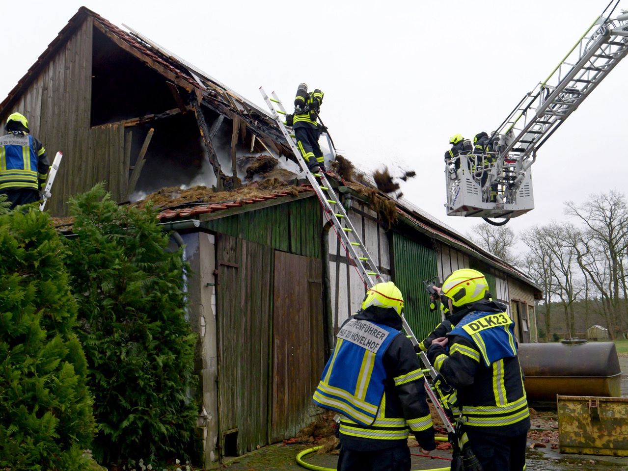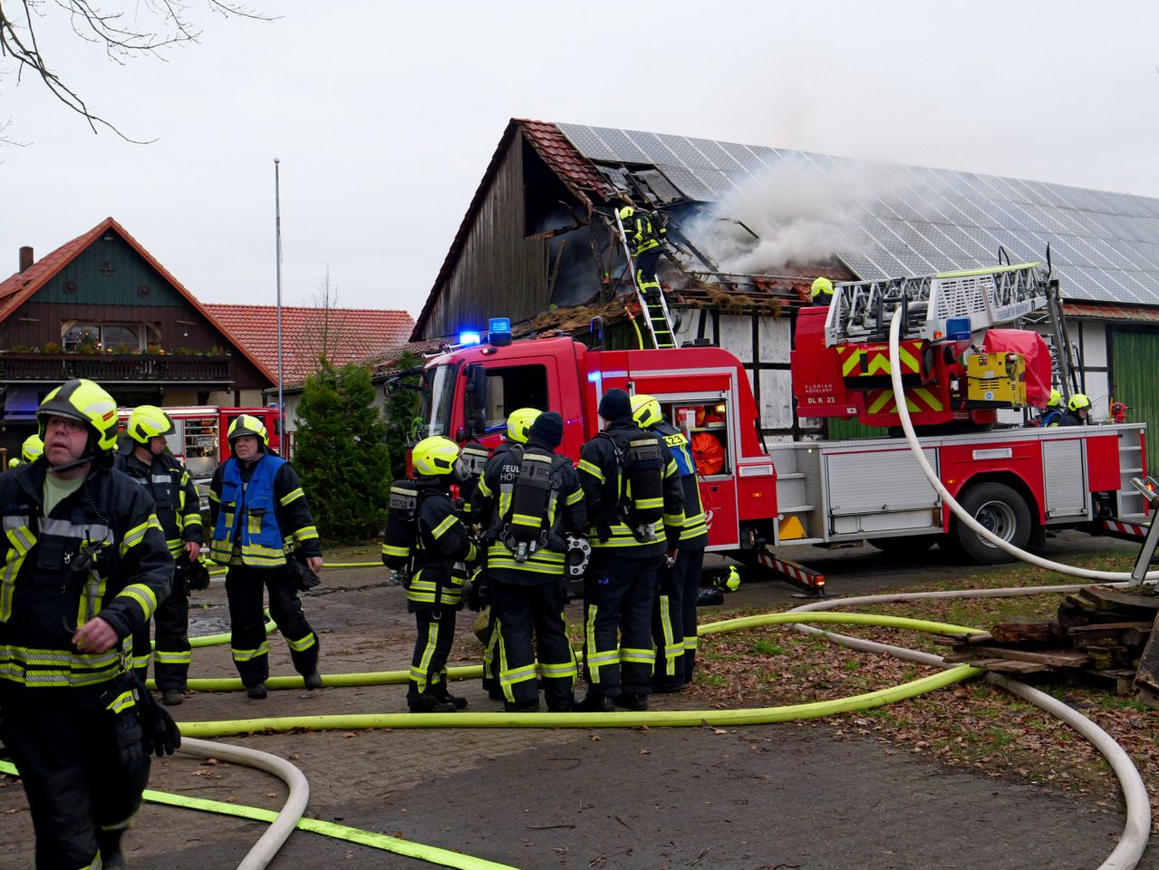 Am Mittag des Neujahrstages musste die Feuerwehr Hövelhof nach Hövelriege ausrücken. Dort stand der Dachstuhl einer Scheune auf einem landwirtschaftlichen Betrieb an der Straße Neue Riege in Flammen. Durch das Feuer wurden Heuvorräte vernichtet und eine großflächige Photovoltaik (PV)-Anlage in Teilen zerstört.