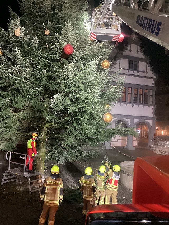Es ist kein Marterpfahl, der gerade am Paderborner Rathaus steht. Es sind die Reste des Weihnachtsbaumes, wie aus einer Pressemitteilung der Stadt Paderborn hervorgeht.