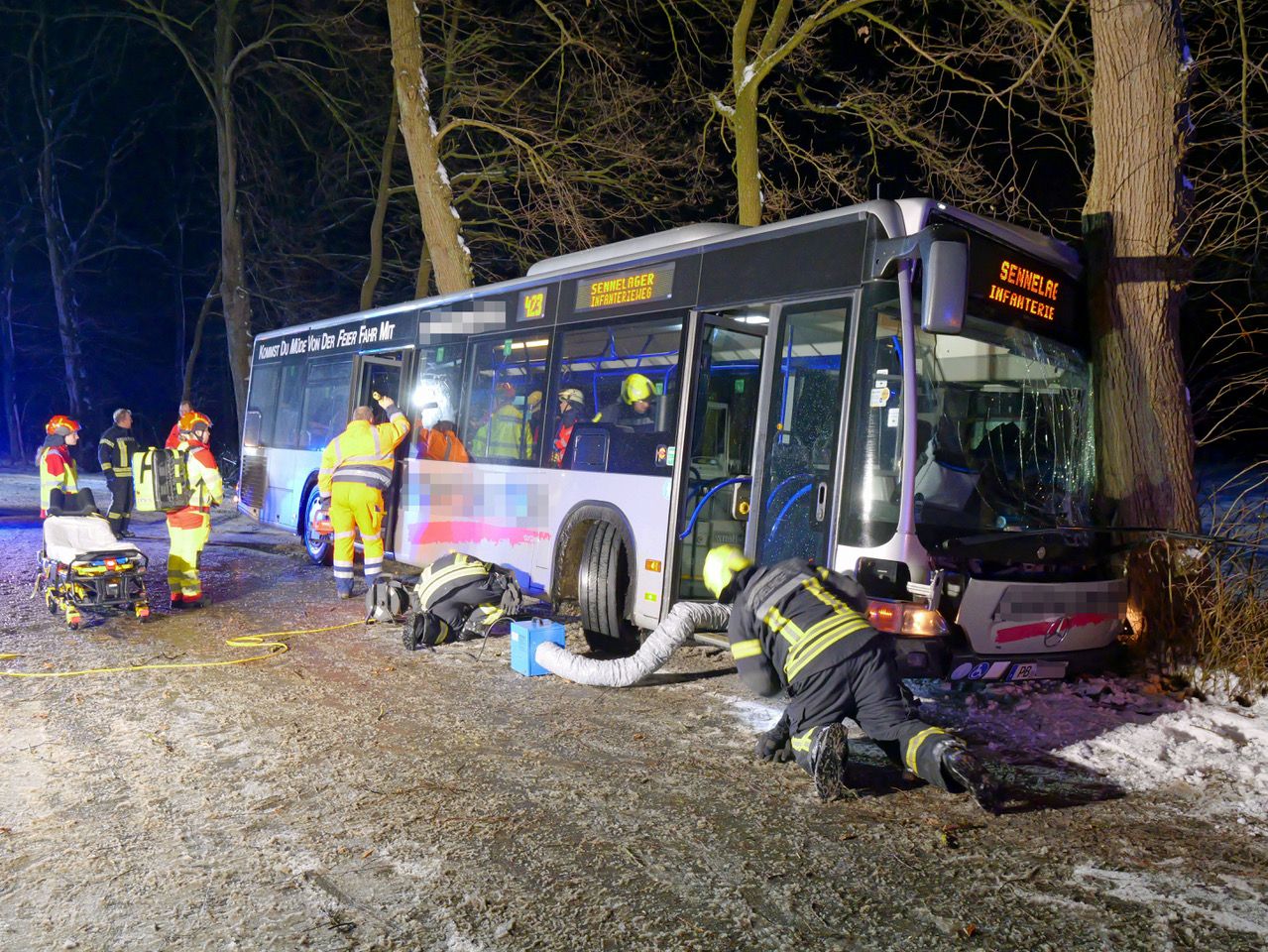 Ebenfalls alarmiert wurde der Leitende Notarzt Thorsten Dahm aus Borchen. Die vier verletzten Insassen wurden zunächst im Bus durch die Notärzte gesichtet und rettungsdienstlich versorgt, bevor sie in die Krankenhäuser eingeliefert wurden. Mit einem Kompaktheizgerät sorgte die Feuerwehr Hövelhof bei Außentemperaturen knapp über dem Gefrierpunkt für Wärme im beschädigten Bus. Außerdem leuchteten in rund 15 Feuerwehrleute die Unfallstelle aus. Ein Mitarbeiter des Hövelhofer Bauhofs streute die Zu- und Abfahrten der Unfallstelle ab.Im Bereich der Senne war es trotz Außentemperaturen von 2 Grad auf den meisten Straßen spiegelglatt , da die Straßen nach der kalten Nacht noch gefroren waren. Das merkte auch Sebsatian Lienen auf der Anfahrt zur Einsatz und warnte die anrückenden Einsatzkräfte über Funk.