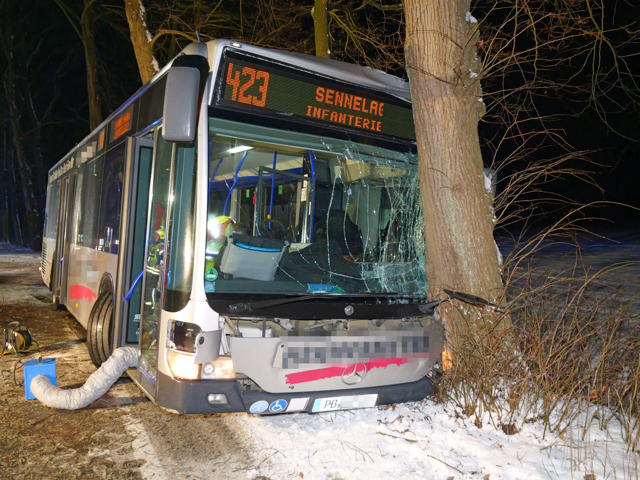 Wenig später endete die Fahrt abrupt. „Ich wollte lenken, aber es ging nicht mehr“, gab der ebenfalls verletzte Fahrer gegenüber der Polizei an und erklärte, der sei etwa mit Tempo 35 unterwegs gewesen.Mit ihm saßen drei männliche Fahrgäste im Bus. Um 6.44 Uhr alarmierte die Leitstelle des Kreises Paderborn die Feuerwehr Hövelhof und ein Großaufgebot an Rettungswagen und Notärzten, berichtet Einsatzleiter Sebastian Lienen, Leiter der Feuerwehr Hövelhof. Vom Rettungsdienst rückten Notärzte aus Bielefeld und Paderborn zur Unfallstelle aus. Vier Rettungswagen aus Bad Lippspringe, Paderborn und Schloß Neuhaus fuhren ebenfalls Richtung Sennelager Straße.