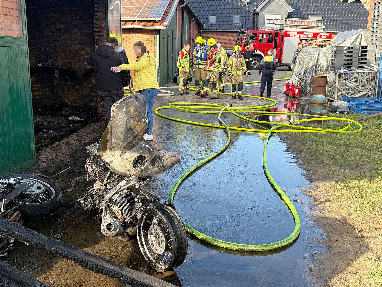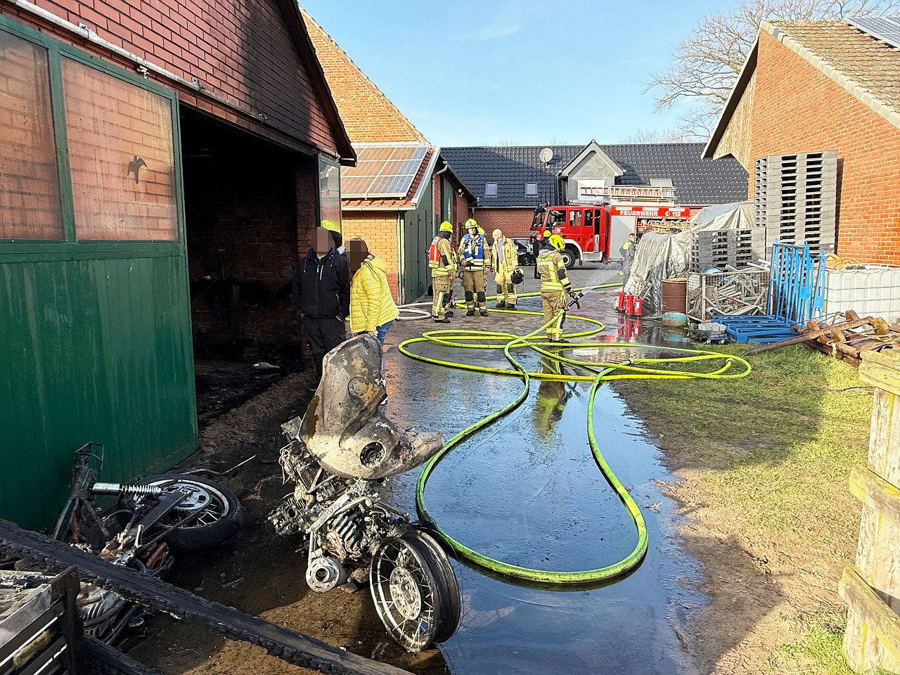 Auf dem landwirtschaftlichen Anwesen war bei Arbeiten an einem älteren BMW-Motorrad plötzlich das betagte Gefährt in Brand geraten. Rasch schlugen die Flammen bis in den Dachstuhl des rund 15 mal 9 Meter großen Nebengebäudes, in dem weitere historische Fahrzeuge standen. Das Feuer griff auf das Dach über, auf dem Solarpanels verbaut waren. Die Flammen brannten ein Loch in die Dacheindeckung. „Über dem Hof stand eine große, schwarze Rauchwolke, die Schlimmstes vermuten ließ“, berichtet Einsatzleiter Heinz Noje, Leiter der Feuerwehr Delbrück.