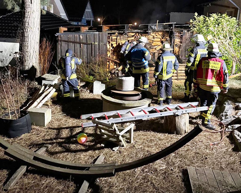 Lichtenau-Holtheim. Die zuerst eintreffenden Einsatzkräfte fanden dort einen brennenden Holzschuppen vor. Durch einen Schnellangriff konnte die Feuerwehrleuten unter Atemschutz die Ausbreitung des Feuers auf eine benachbarte Garage verhindert werden. Unterstützt wurden sie bei der Brandbekämpfung durch einen weiteren Trupp unter Atemschutz mit einem weiteren Rohr. Um mögliche Glutnester lokalisieren zu können, musste der Holzschuppen teilweise leer geräumt werden.