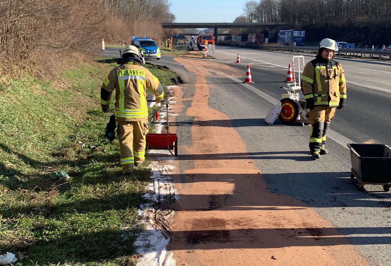Glück im Unglück hatte am Dienstagmittag der Fahrer eines Mercedes Sprinters bei einem Verkehrsunfall auf der Autobahn 44. Gegen 11.30 Uhr kam er auf der Richtungsfahrbahn Dortmund in Höhe der Anschlussstelle Geseke aus ungeklärter Ursache nach rechts von der Fahrbahn ab, überfuhr die rechte Schutzplanke und riss sich dabei den Tank und die Ölwanne auf, berichtet Jens Götte, stellvertretender Leiter der Feuerwehr Büren.
