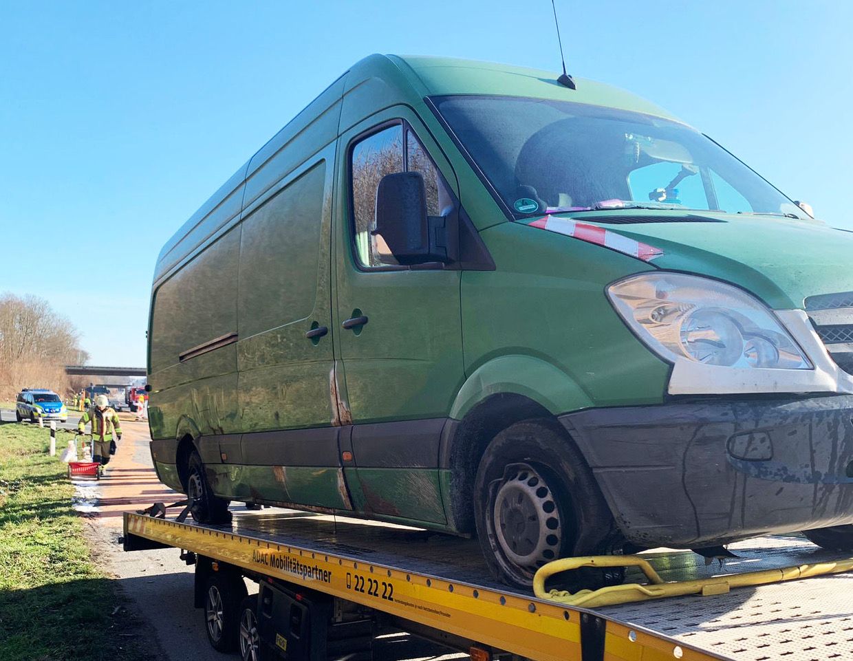 Zusätzlich fuhren ein Löschfahrzeug der Kreisfeuerwehrzentrale, ein Rettungswagen und der Bürener Notarzt zur Unfallstelle.Die eintreffenden Kräfte stellten fest, dass der Fahrer des Sprinters weder eingeklemmt noch verletzt war, so Michael Stork, Leiter der Feuerwehr Büren. Die Bürener Einsatzkräfte sicherten die Unfallstelle ab, streuten ausgelaufene Betriebsstoffe ab und reinigten die Fahrbahn. Anschließend wurde der beschädigte Sprinter aufgeladen und abtransportiert.