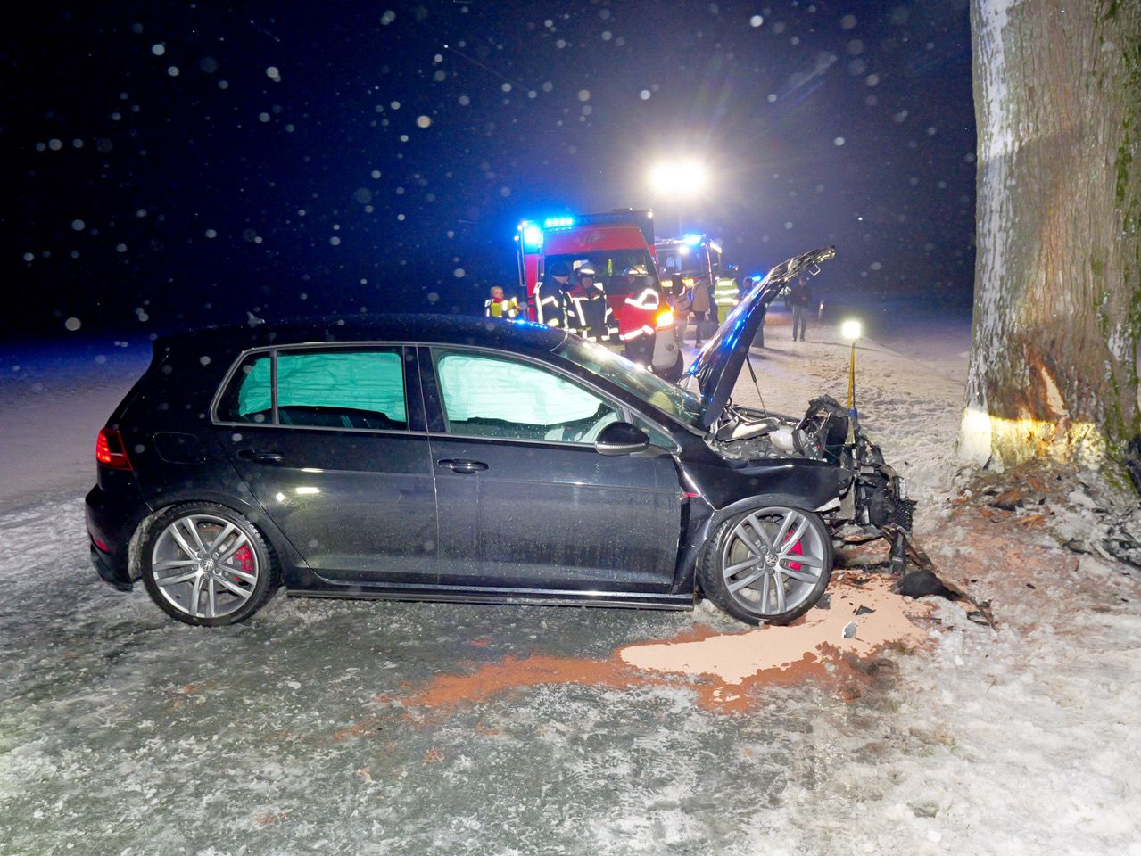 Eine mehrere Zentimeter dicke, geschlossene Schneedecke wurde dem 24 Jahre alten Golf-Fahrer zum Verhängnis. Er verlor die Kontrolle über seinen Wagen, der ins Schleudern kann und nach rechts auf die Bankette geriet. Anschließend prallte der Wagen mit dem rechten Frontbereich gegen einen Straßenbaum. Durch den Anprall wurden zwei 18 und 50 Jahre alte Frauen und ein 12-jähriger Junge nach Angaben der Polizei schwer verletzt. Der Fahrer blieb als einziger unverletzt. Andere Verkehrsteilnehmer hatten nach dem Unfall per Notruf die Feuerwehr verständigt. Zunächst rückten aber um 23.25 Uhr nur die Notfallhelfer der First Responder und ein Löschgruppenfahrzeug zur Unterstützung aus.