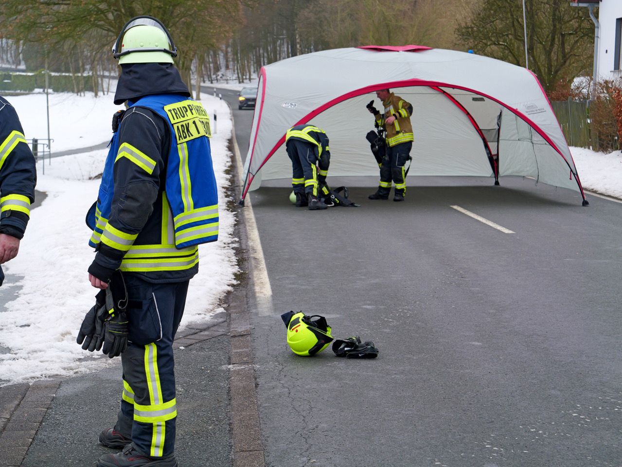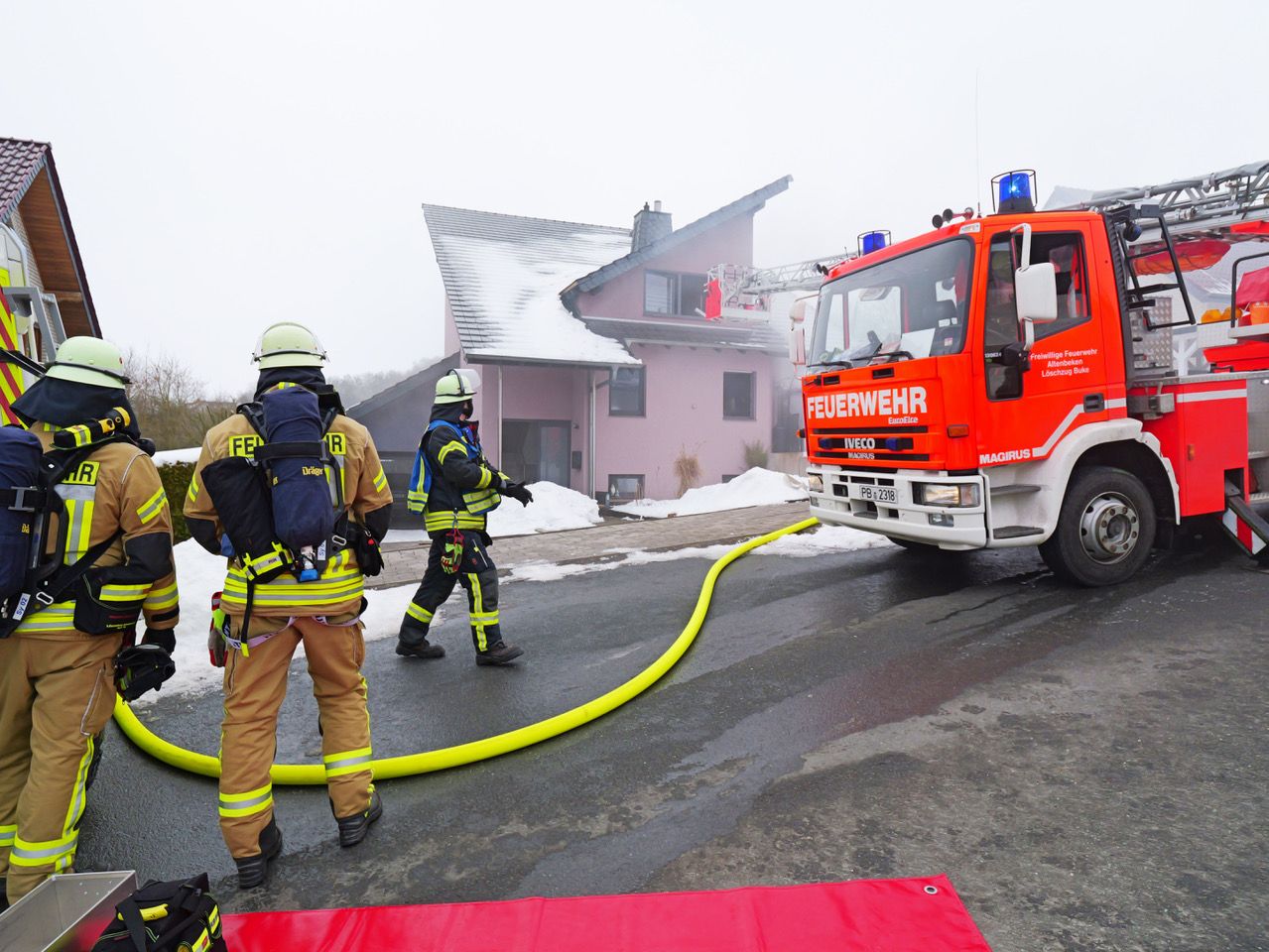 Bereits auf der Anfahrt wies eine schwarze Rauchwolke der Feuerwehr den Weg in Richtung Sportplatz und Winterbergstraße. Daraufhin ließ Einsatzleiter Sebastian Kaiser, stellvertretender Leiter der Feuerwehr Altenbeken, das Einsatztischwort auf „Dachstuhlbrand“ erhöhen, worauf sämtliche Löschzüge der Gemeinde alarmiert wurden. Aufgrund der Witterungsverhältnisse waren die Löschfahrzeuge und die Drehleiter in der Eggegemeinde noch mit Schneeketten ausgerüstet.