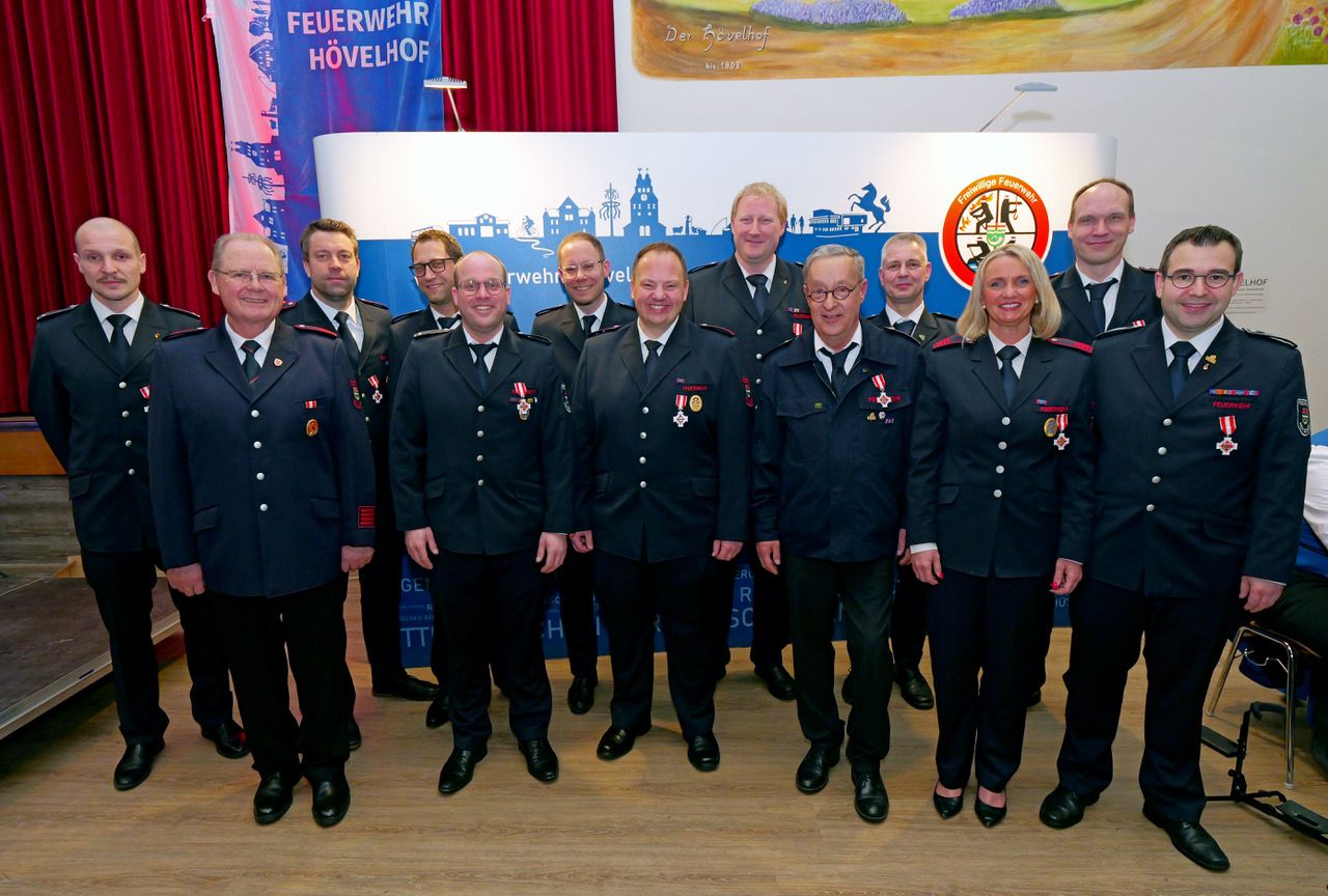 Hövelhof. Bei der Jahreshauptversammlung im Schützen- und Bürgerhaus zogen die Blauröcke eine Bilanz eines anstrengen Jahres, das 81 Einsätze mehr als im Jahr 2024 auswies. Neben 56 Brandeinsätzen, so André Kipshagen im Jahresbericht, rückten die Aktiven zu 231 Hilfeleistungseinsätzen aus. Die First Responder, die Notfallhelfer, gingen 47 Mal in den Einsatz, 17 Mal war das Notfallseelsorgeteam an Einsatzstellen gefragt. 48 Mal stand der Vorbeugende Brandschutz bei Brandschutzschulungen und der Brandschutzerziehung im Mittelpunkt. 16 Einsätze führten die Hövelhofer auch über die Ortsgrenzen hinaus in die Nachbarkommunen, in der Regel mit der Erkundungsdrohne.
