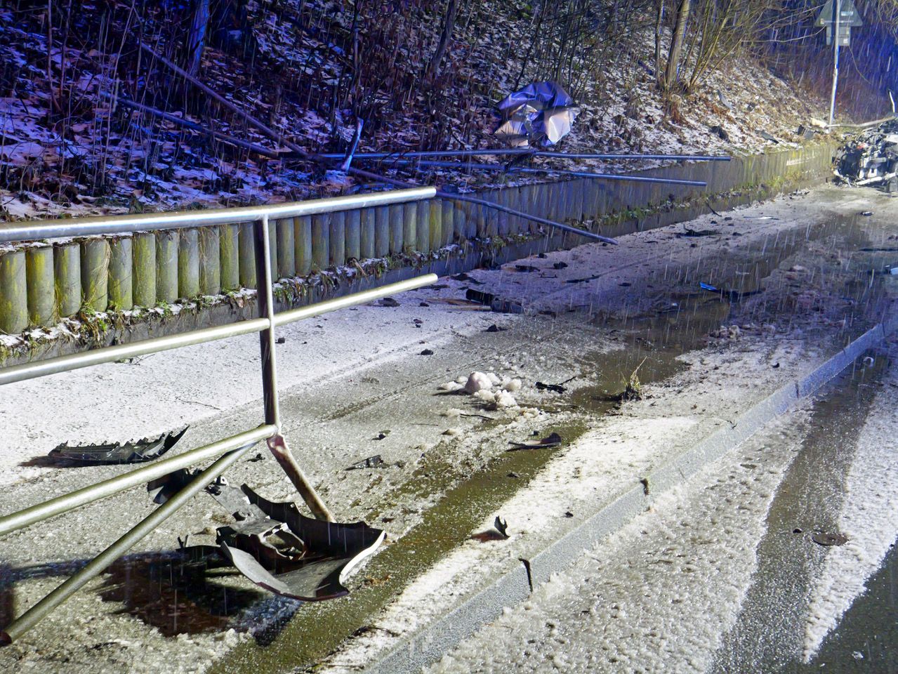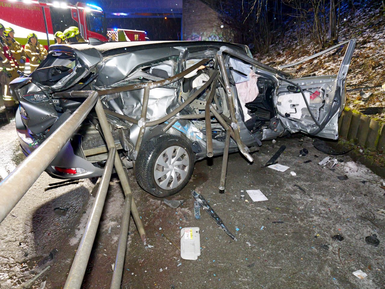 Wegen des schnell fahrenden Toyota entschloss sich das Team, die Kontrolle abzubrechen und dem Wagen zu folgen. Der war inzwischen in einer leichten Linkskurve kurz vor der Bahnbrücke ins Schleudern gekommen, rutschte auf die Gegenfahrbahn und schlug dort in ein Rohrgitter ein, das den Fahrradweg von der Fahrbahn trennt. Durch den Anprall drehte sich Wagen, und Gitterteile bohrten sich an der Beifahrerseite im Heckbereich in das Fahrzeug, in dem alle Airbags auslösten. Teile der Rohrkonstruktion und Fahrzeugteile wurden etwa 20 Meter weit weggeschleudert.