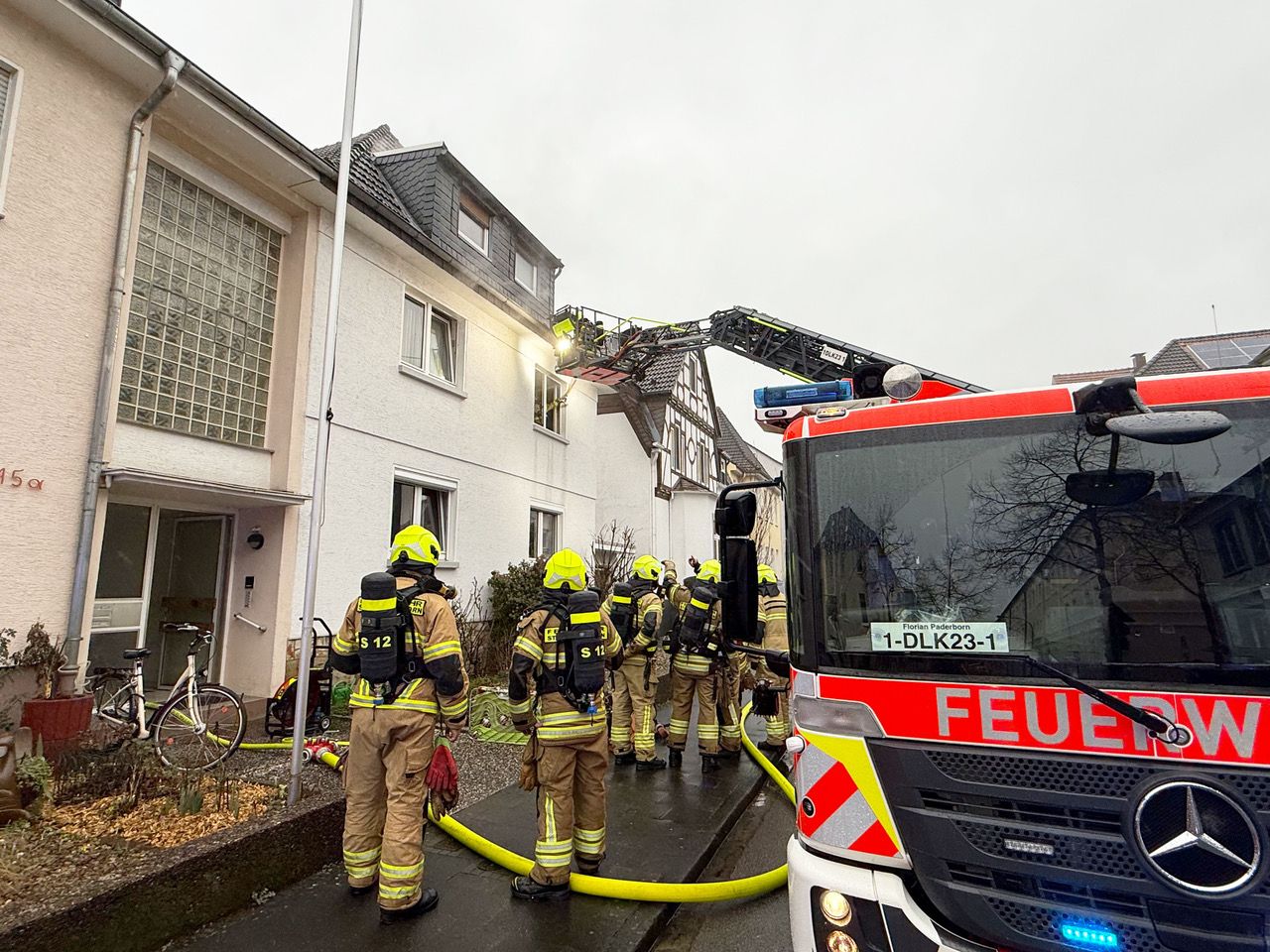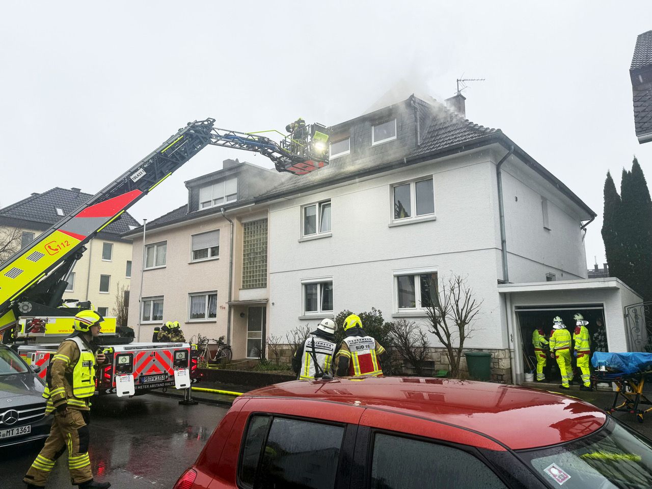 Zur gleichen Zeit quoll aus dem ausgebauten Dachgeschoss bereits dichter, gelblicher Rauch, so dass die Feuerwehr zunächst von einem Dachgeschoss- oder Dachstuhlbrand ausging. Bei der Durchsuchung der einzelnen Wohnungen entdeckte ein Angriffstrupp den Brandherd in einem Eckzimmer im ersten Obergeschoss. Beim Löschen der Flammen stellten die Feuerwehrleute fest, dass sich das Feuer offenbar durch die Zimmerdecke bereits in die Wohnung im Dachgeschoss ausgebreitet hatte. Dabei wurde die Zwischendecke und die Dachhaut geöffnet.