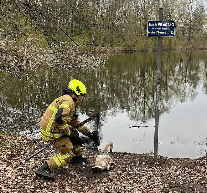 Die Feuerwehr Paderborn wurde gegen 14:30 Uhr zu einem ungewöhnlichen Einsatz im Bereich der Fischteiche alarmiert: Ein Schwan hatte sich im Gleisbereich verirrt und konnte diesen aufgrund der beidseitigen Einzäunung nicht mehr eigenständig verlassen.