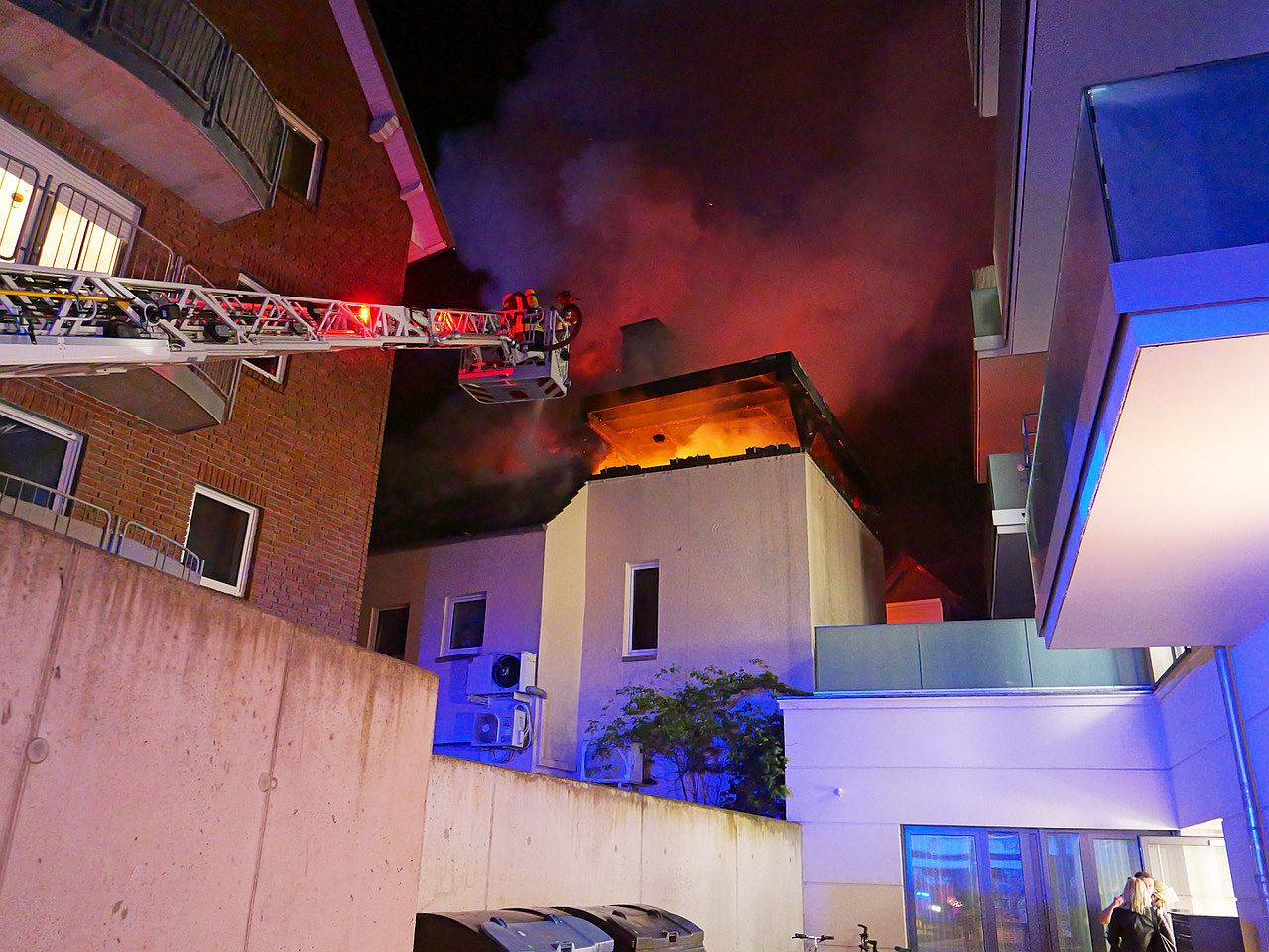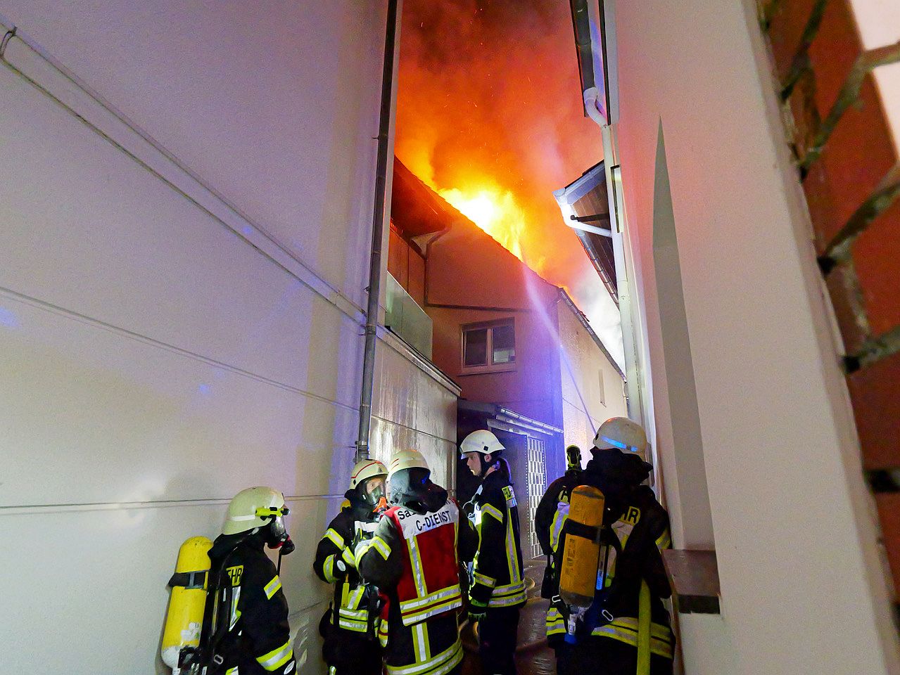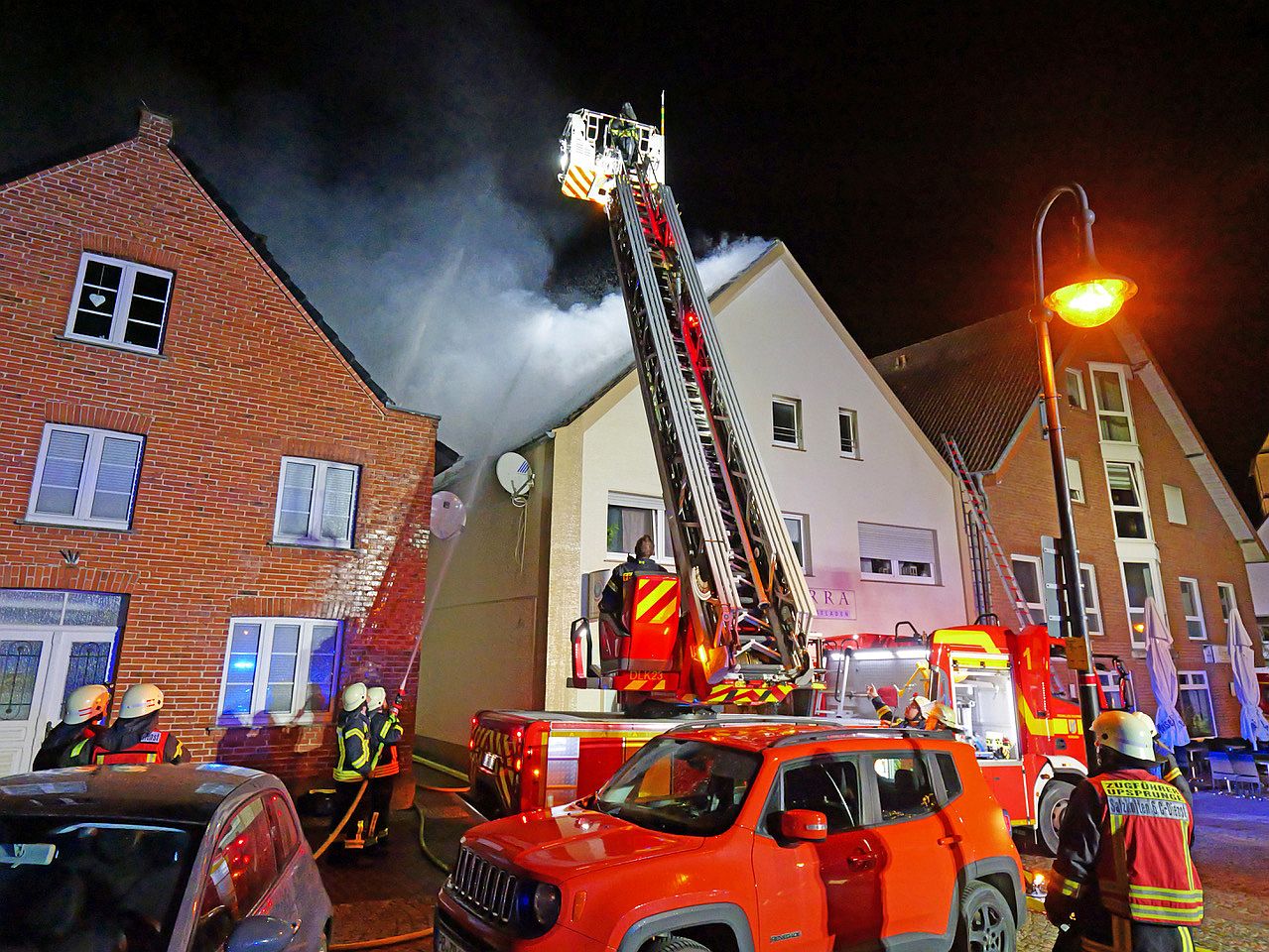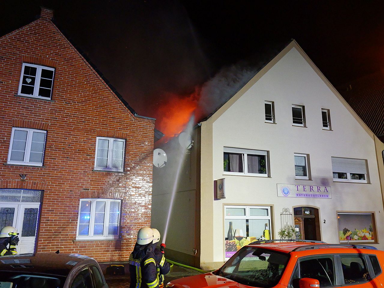Ein Großbrand hat in der Nacht zu Freitag den Dachstuhl eines Wohn- und Geschäftshauses in der Salzkottener Innenstadt zerstört. Bis zu 85 Feuerwehrleute aus Salzkotten, Borchen und Hövelhof waren bis in die frühen Morgenstunden des Freitags mit Löscharbeiten beschäftigt. Personen kamen nicht zu Schaden. Der Sachschaden wird mindestens auf einen sechsstelligen Betrag geschätzt.