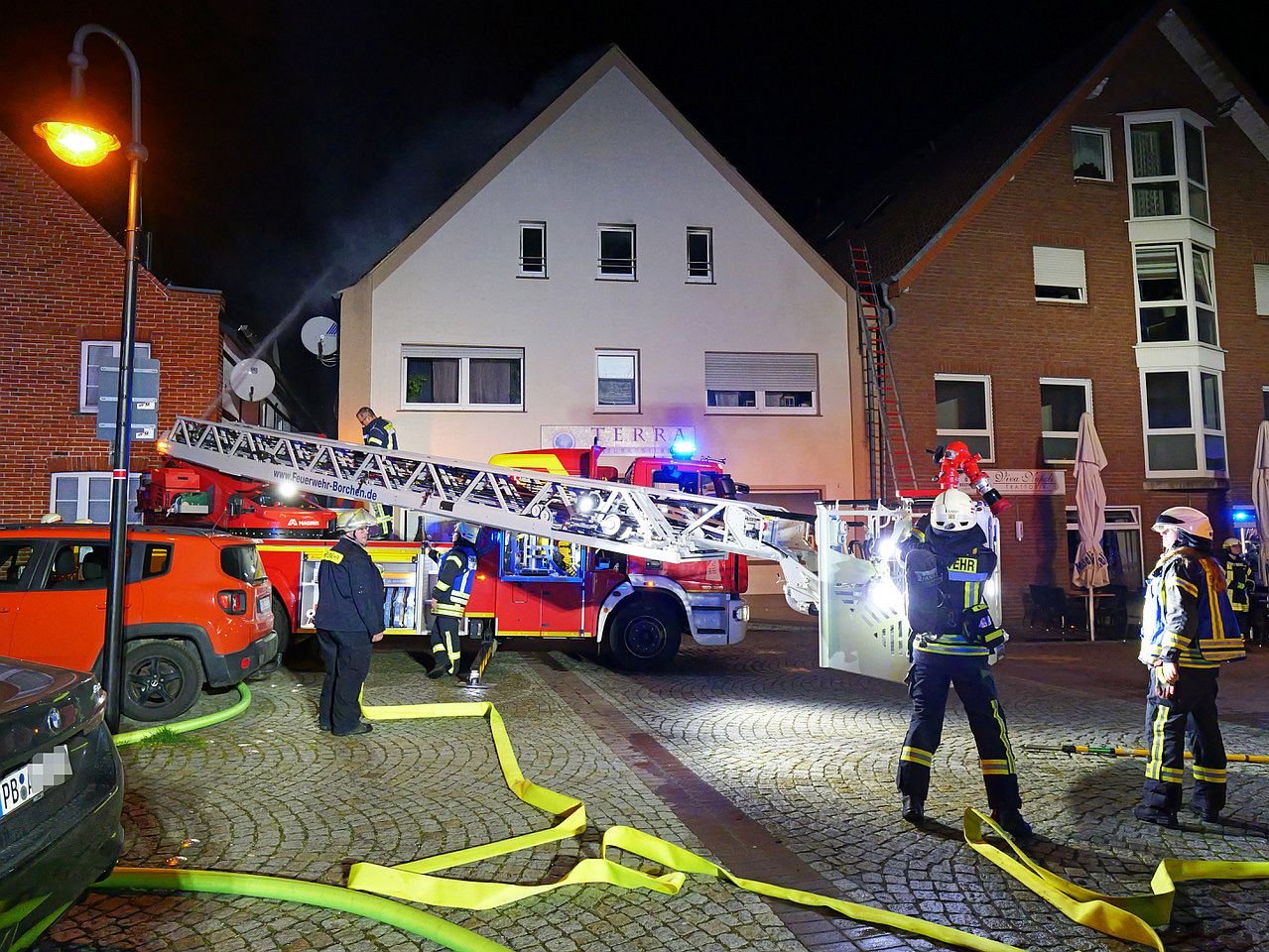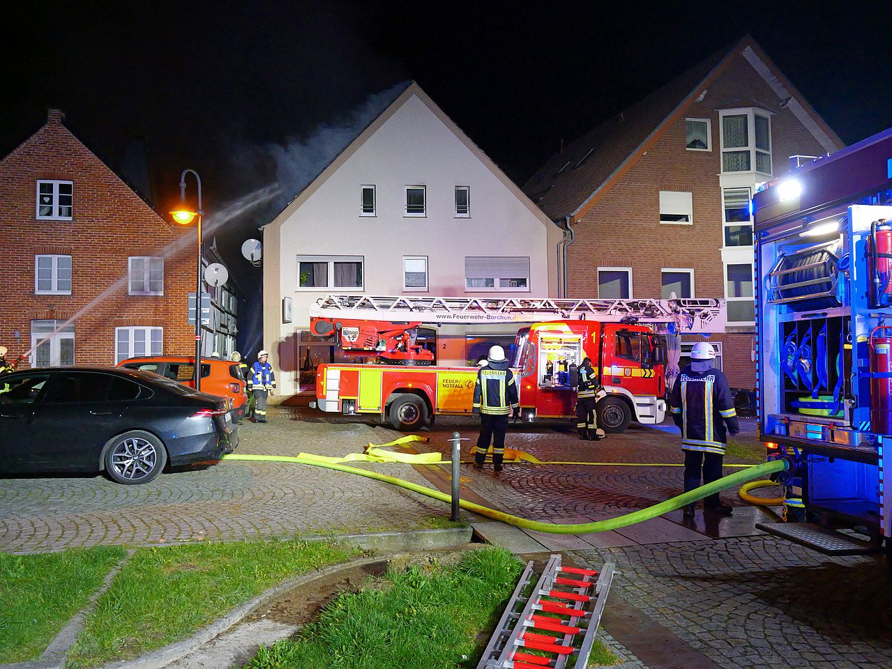 Feuerwehr und Polizei evakuierten das östlich angrenzende Gebäude, das im Erdgeschoss eine Trattoria beherbergt. Aufgrund der beengten Verhältnisse in der Lohne ließ Einsatzleiter Christoph Schlünz, stellvertretender Leiter der Feuerwehr Salzkotten, auch die Feuerwehr Borchen alarmieren. Aus dem Korb der Borchener Drehleiter wurde die Dachhaut im südlichen Giebelbereich geöffnet und Dachfenster eingeschlagen, damit der Brandrauch abziehen konnte. Ebenfalls unterstützend wurde auch die Feuerwehr Hövelhof tätig. Die Drohneneineinheit aus der Sennegemeinde kontrollierte den Dachstuhl mit der Aufklärungsdrohne. Der Abrollbehälter Atemschutz sorgte für den nötigen Nachschub an Atemschutzgeräten.