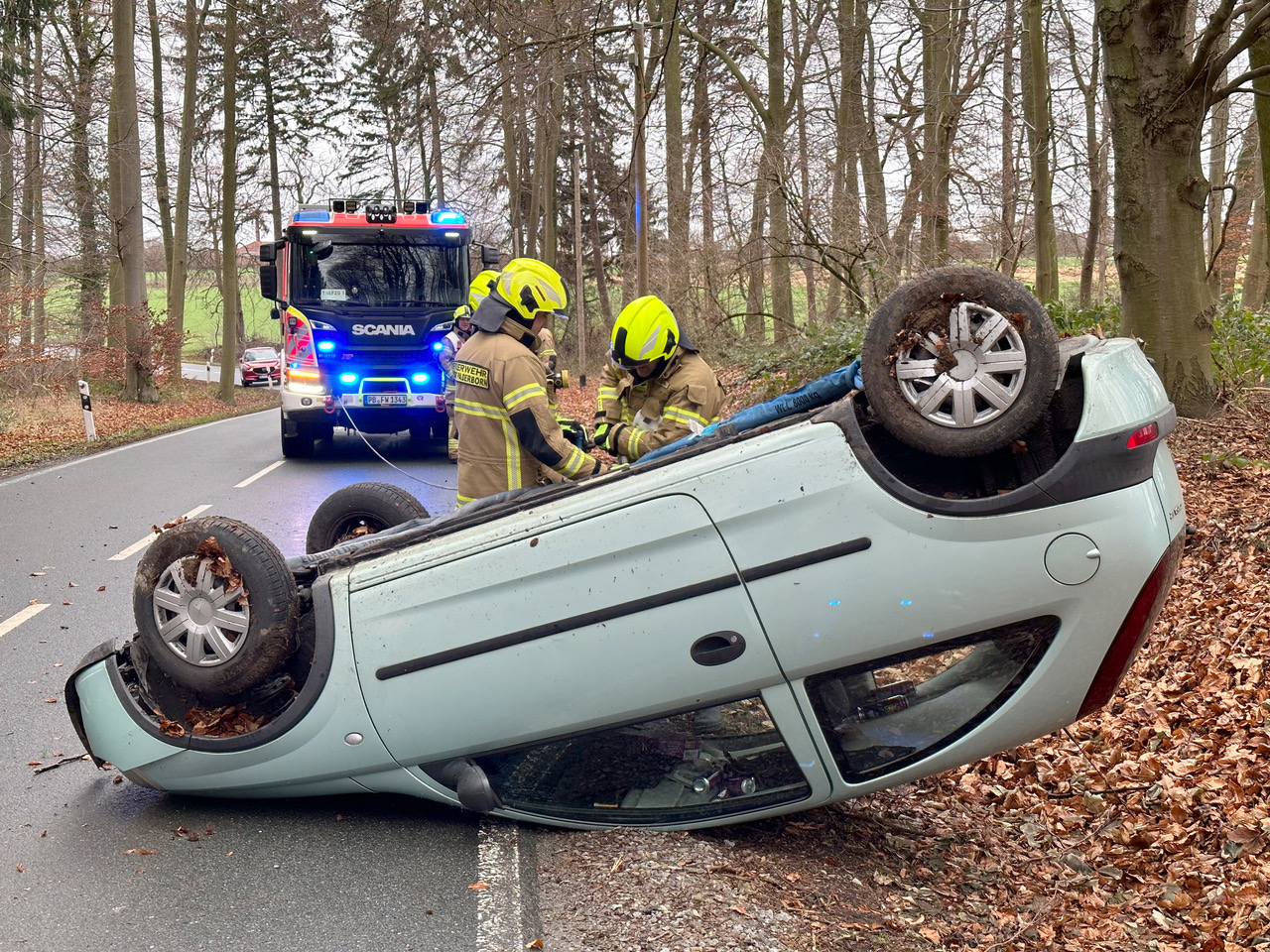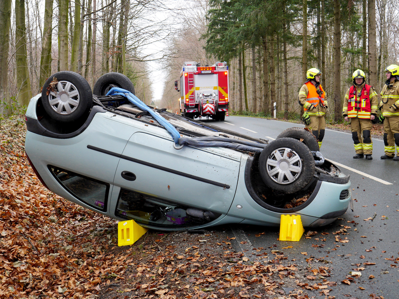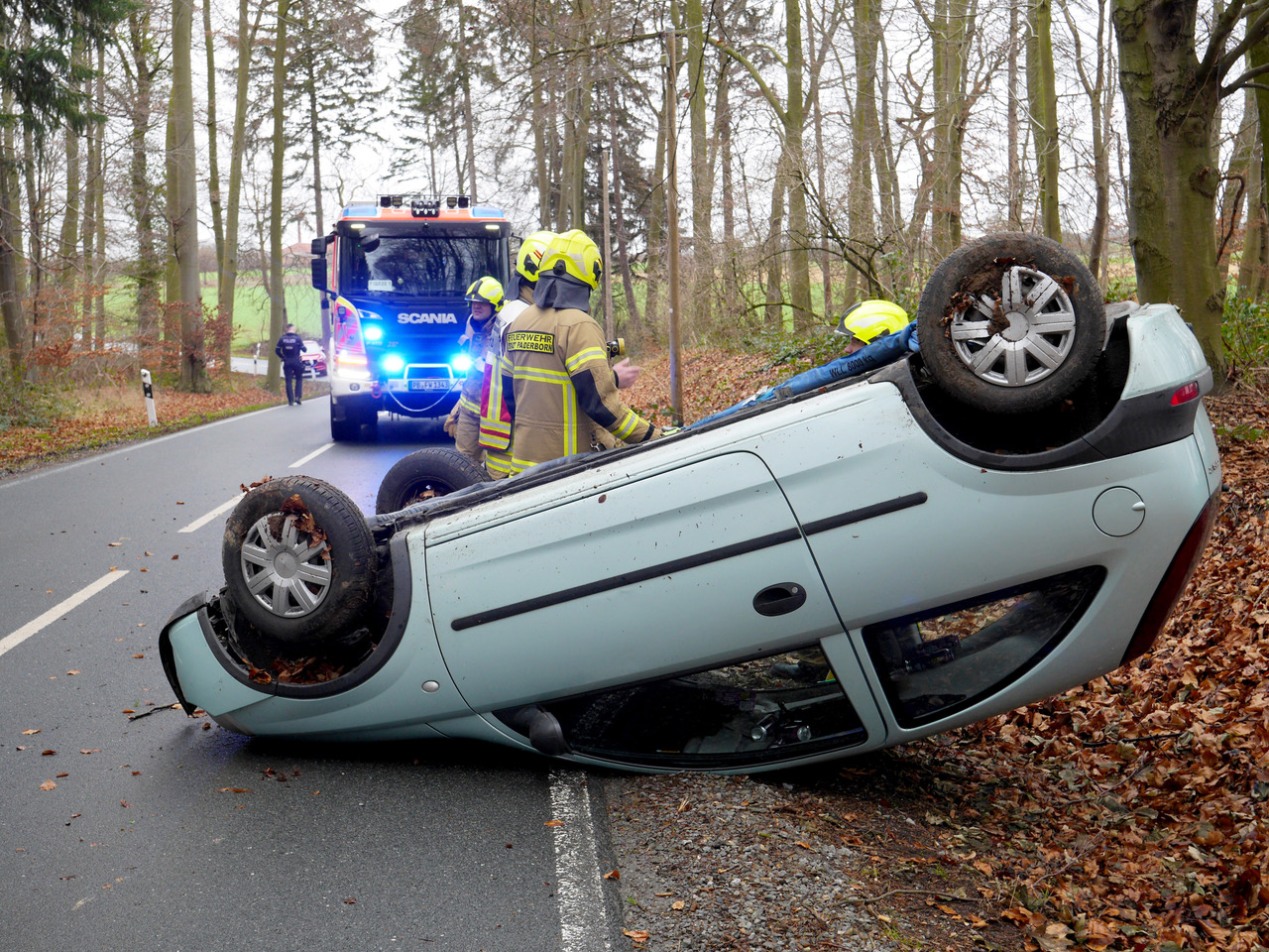 Paderborn-Wewer. Auf dem Dach landete am Mittwochmittag ein 21 Jahre alter Autofahrer mit seinem Opel Corsa. Auf dem Weg vom Kreisverkehr am Kleinen Hellweg (K37) in Richtung Salzkotten geriet der junge Fahrer kurz nach 13 Uhr in einem Waldstück mit seinem Wagen auf die seitliche Bankette. Beim Gegenlenken überschlug sich das Fahrzeug und blieb quer auf der Gegenfahrbahn liegen.