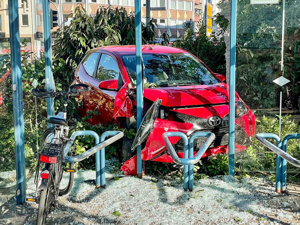 Bei einem Verkehrsunfall am Westerntor verlor am frühen Samstagabend eine 82 Jahre alte Autofahrerin die Kontrolle über ihren Kleinwagen, der Sekunden später in einen verglasten Fahrradunterstand vor der Herz-Jesu-Kirche prallte.