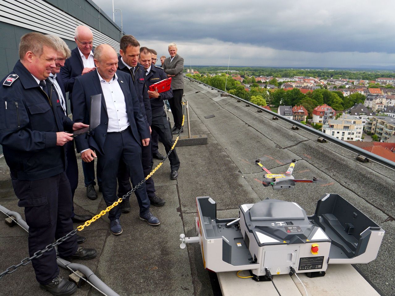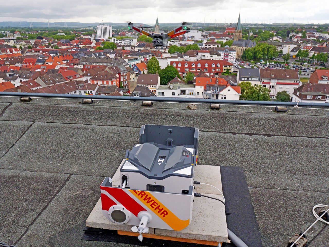 Mit dem kurzen Hüpfer einer leistungsfähigen Erkundungsdrohne vom Dach des Kreishauses zum Padersteinweg hat der Kreis Paderborn am Freitag bundesweit Technikgeschichte geschrieben, denn die Drohne flog dabei wie Flugzeug autonom. Ein Transponder an Bord sorgt dafür, dass die Drohne von allen anderen Luftfahrzeugen und der Flugsicherung gesehen wird. Der Kreis Paderborn ist der erste Landkreis in Deutschland, der eine solche Technik am Start hat.