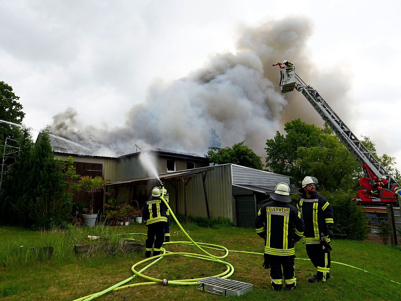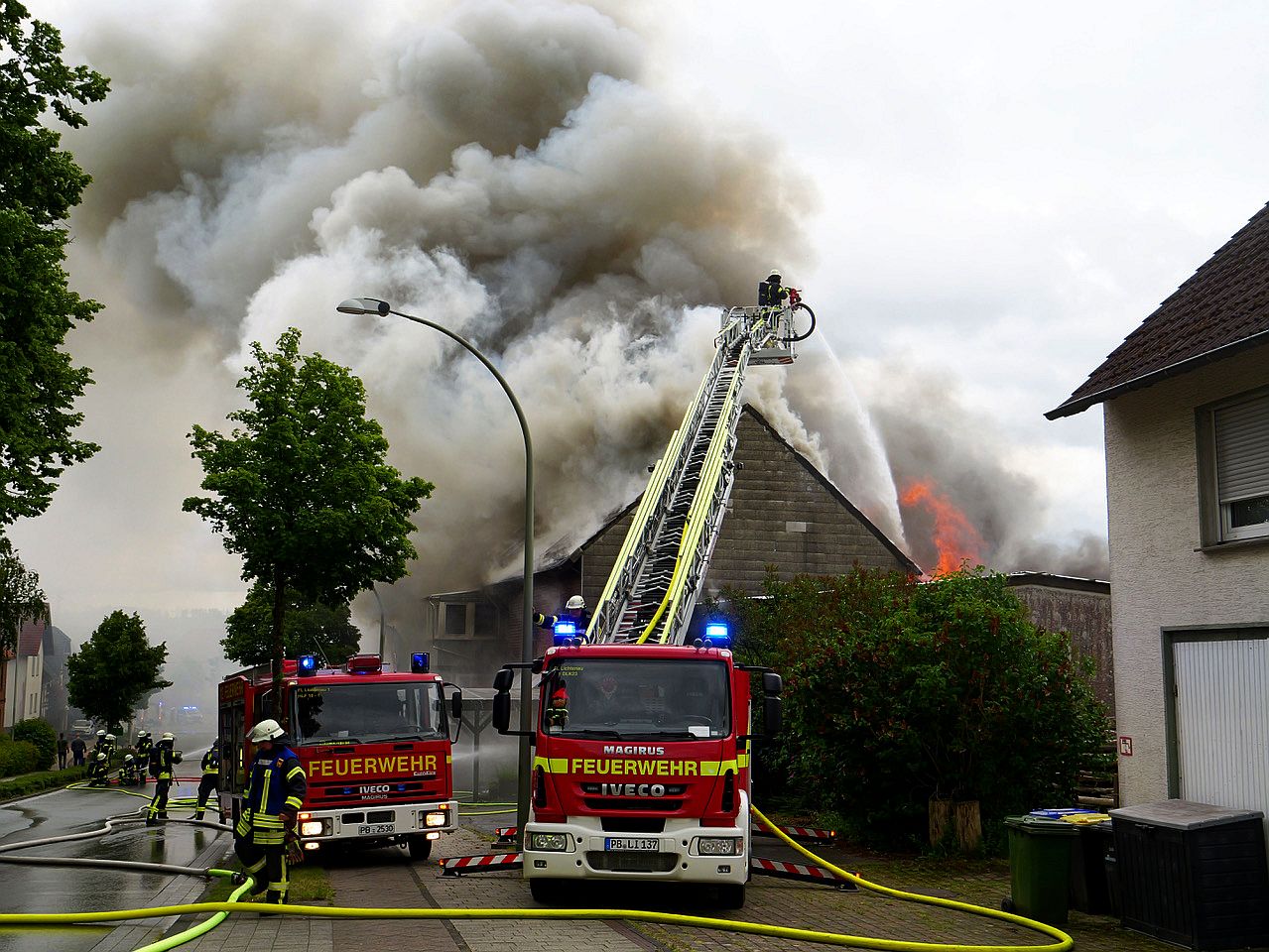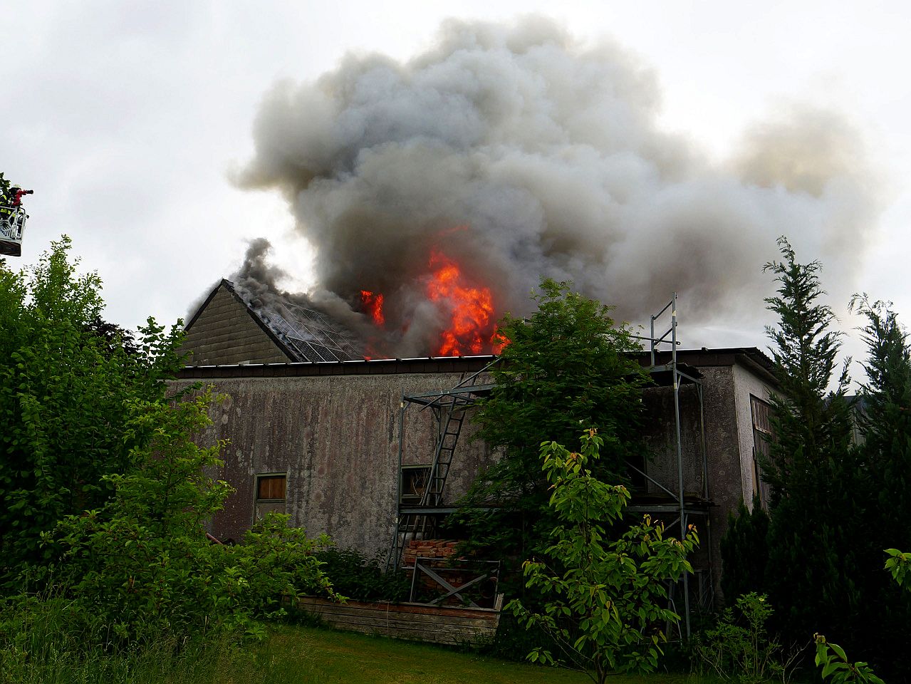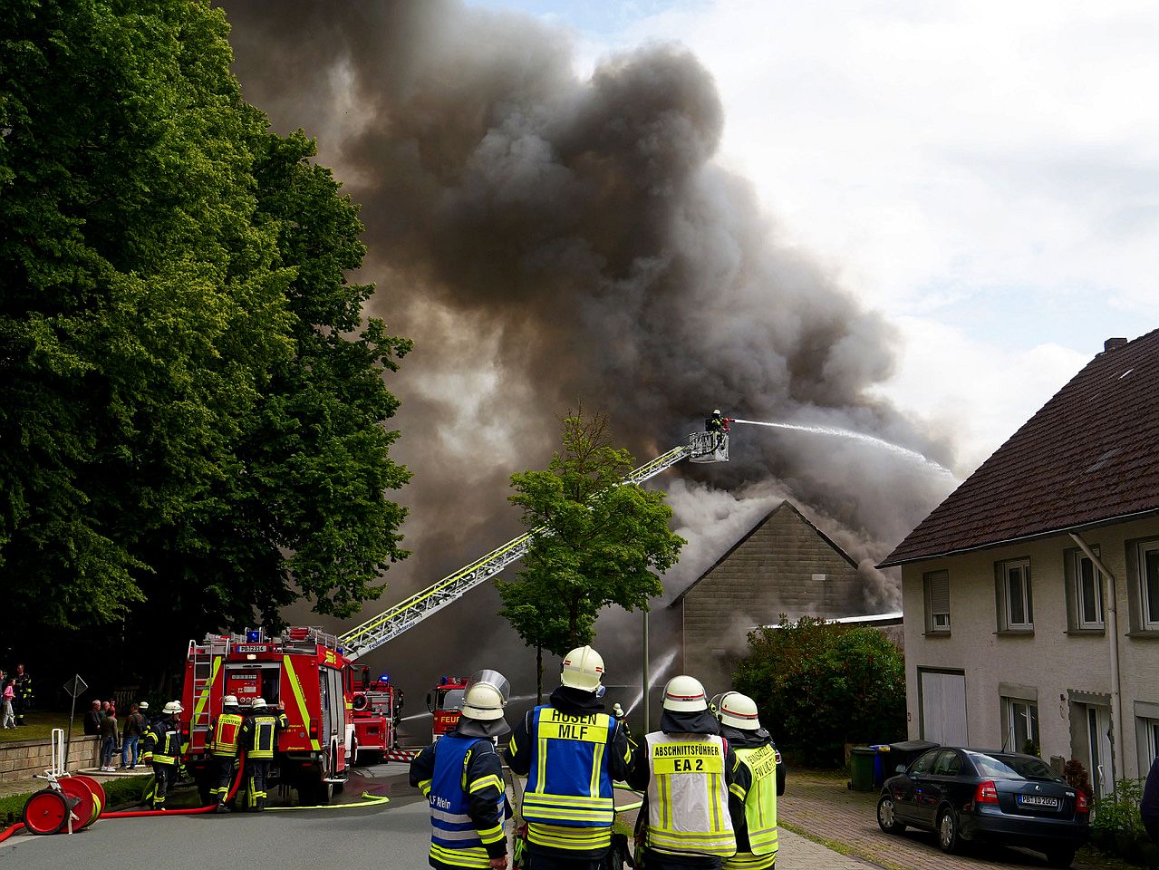 Ein Zweifamilienhaus an der Hauptstraße im Lichtenauer Stadtteil Kleinenberg mit angrenzender Tischlerwerkstatt ist am frühen Samstagnachmittag durch einen Großbrand vollkommen zerstört worden. Ein angrenzendes Wohnhaus wurde durch Löschwasser schwer in Mitleidenschaft gezogen. Die Feuerwehren aus Lichtenau und Borchen sowie der Löschwassertransportzug des Kreises waren mit mehr als 80 Kräften in der Spitze bis zum Pfingstsonntag im Einsatz. Die Hauptstraße ist im Bereich der Brandstelle auch am Sonntagmorgen weiterhin gesperrt.