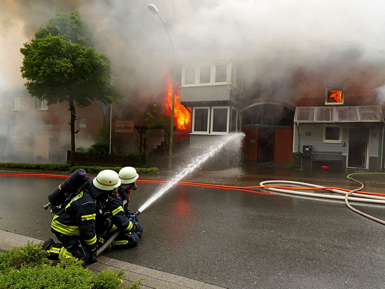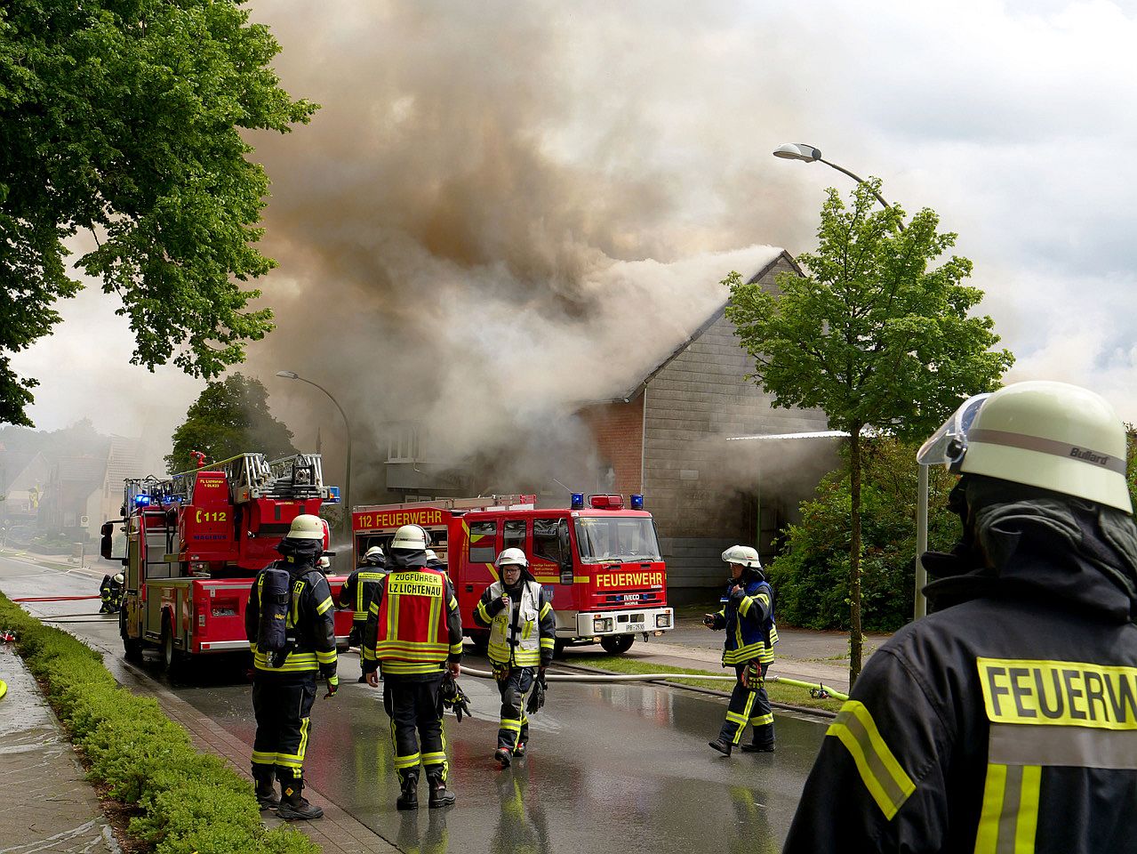 Heimspiel für die Feuerwehr Hövelhof: Am Pfingstmontag musste die Feuerwehr Hövelhof zu einem gemeldeten Zimmerbrand am Alten Markt ausrücken. Die Einsatzstelle lag direkt gegenüber vom Neubau des Feuerwehrgerätehauses und schräg gegenüber der temporären Fahrzeughalle.