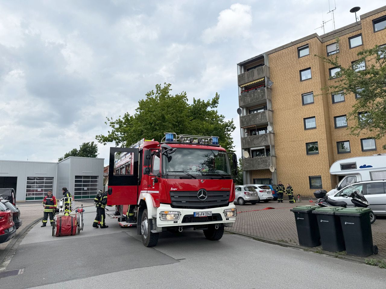 Brand in einem Mehrfamilienhaus an der Detmolder Straße. Drei Personen wurden verletzt und mussten mit dem Verdacht auf Rauchgasintoxikation in ein Krankenhaus gebracht werden.