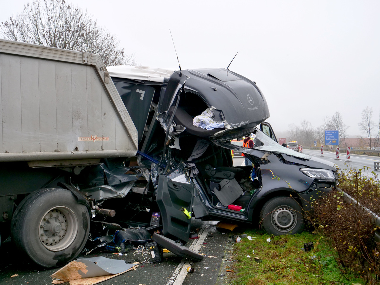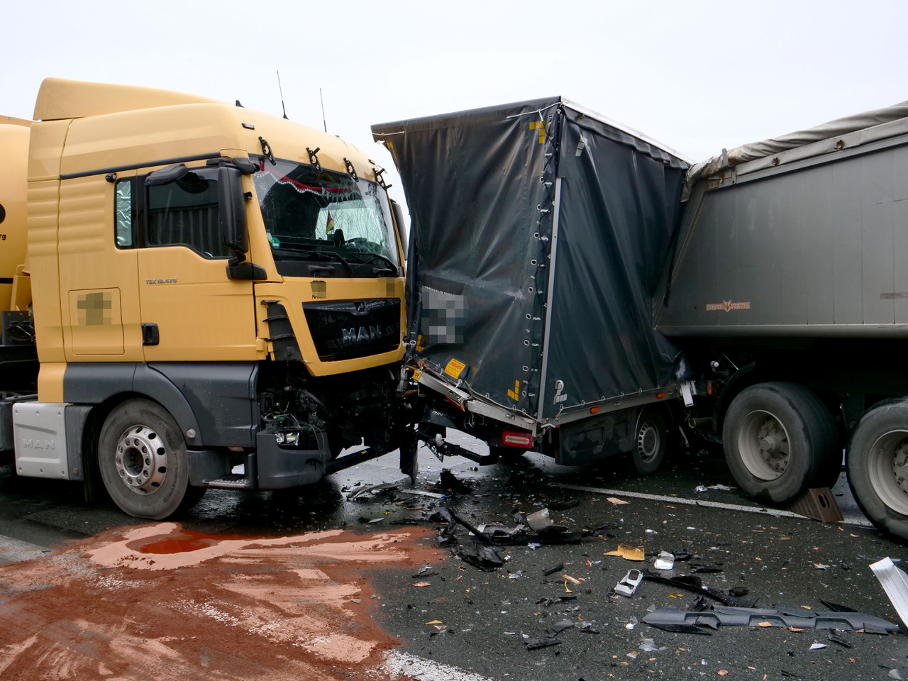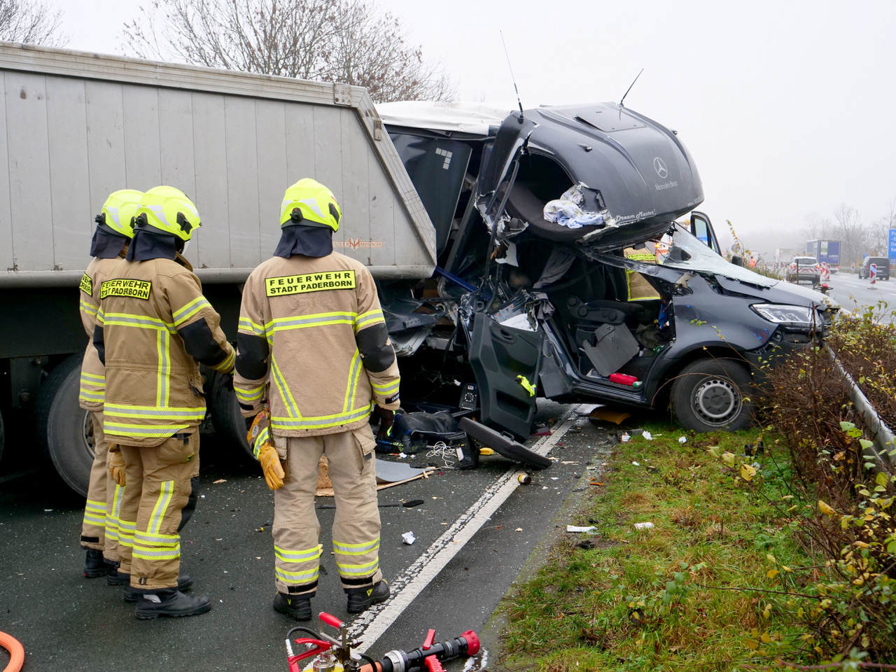 Der Unfall ereignete sich gegen 11.55 Uhr etwa 300 Meter hinter der Anschlussstelle Elsen. Die Unfallstelle liegt direkt auf der Brücke über die Straße Im Schlinge. Am Stauende hielte ein 53-Jähriger aus Bielefeld mit seinem Sattelzug und ein 29 Jahre alter Fahrer eines polnischen Kleinlasters am Stauende an. Danach fuhr ein Silozug aus dem niedersächsischen Landkreis Gifhorn, gesteuert von einem 55 Jahre alten Mann, auf das polnische Gespann auf und schob es auf den haltenden Sattelzug.