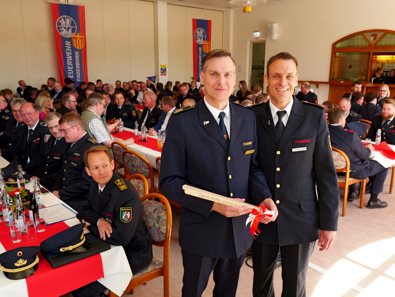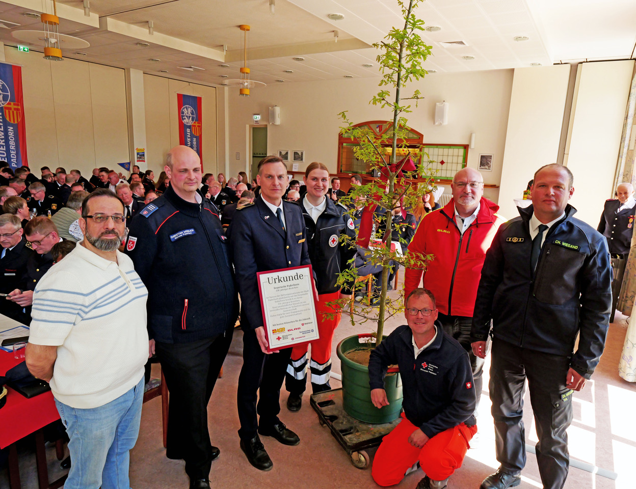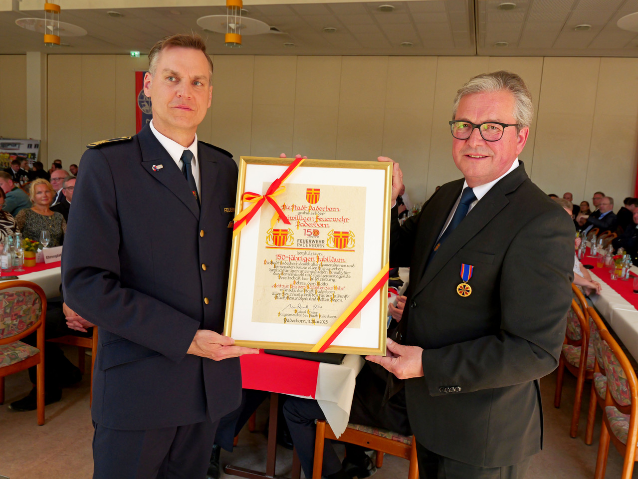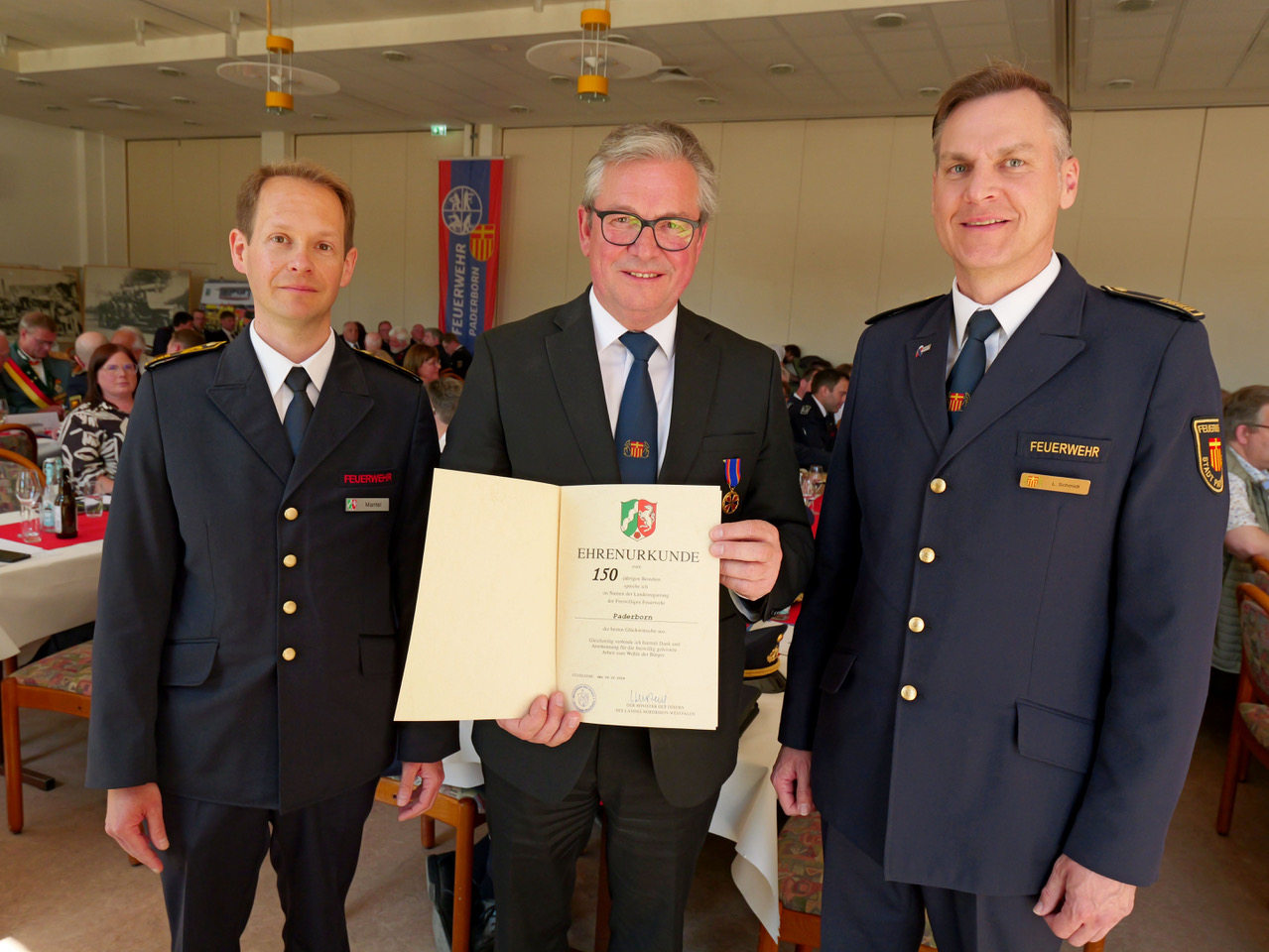 Rund 250 Delegierte und Gäste der Verbandsversammlung des Verbandes der Feuerwehr (VdF) im Kreis Paderborn gratulierten am Samstagnachmittag in der Schlosshalle im Neuhäuser Schlossgarten der Feuerwehr Paderborn zum 150-jährigen Bestehen.