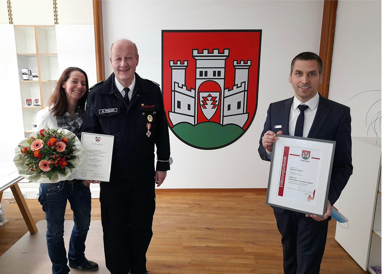 Stadtbrandinspektor Andreas Müller als Leiter der Freiwilligen Feuerwehr in Büren verabschiedet. Bürgermeister überreicht mit Dank und Anerkennung die Entlassungsurkunde. Der Leiter der Bürener Freiwilligen Feuerwehr, Stadtbrandinspektor Andreas Müller, legt auf eigenen Wunsch sein Amt bei der Stadt Büren nieder, um sich neuen Aufgaben auf Kreisebene zuzuwenden.