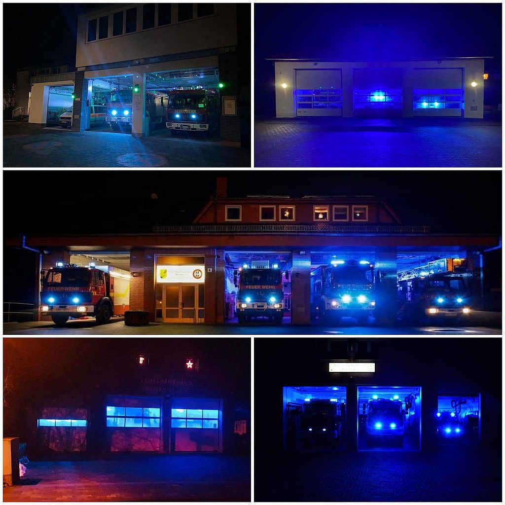 Aktion der Feuerwehren taucht Wachen in blaues Licht. Unter dem "Hashtag" bluelightfirestation machen die Feuerwehren im Land derzeit auf die besonderen Herausforderungen in Corona-Zeiten aufmerksam.