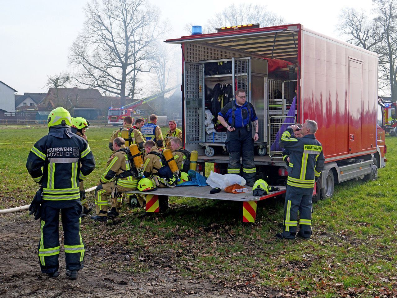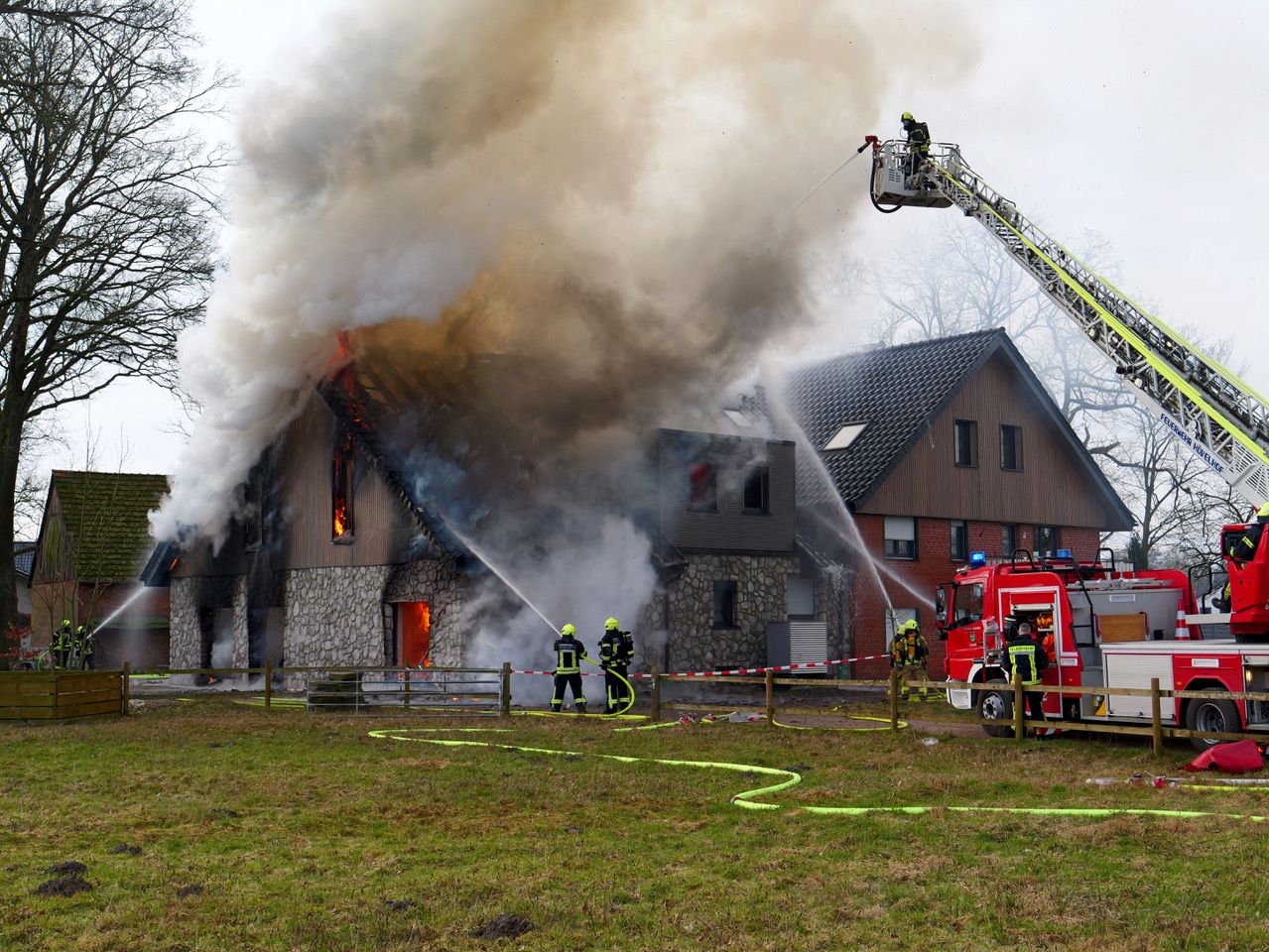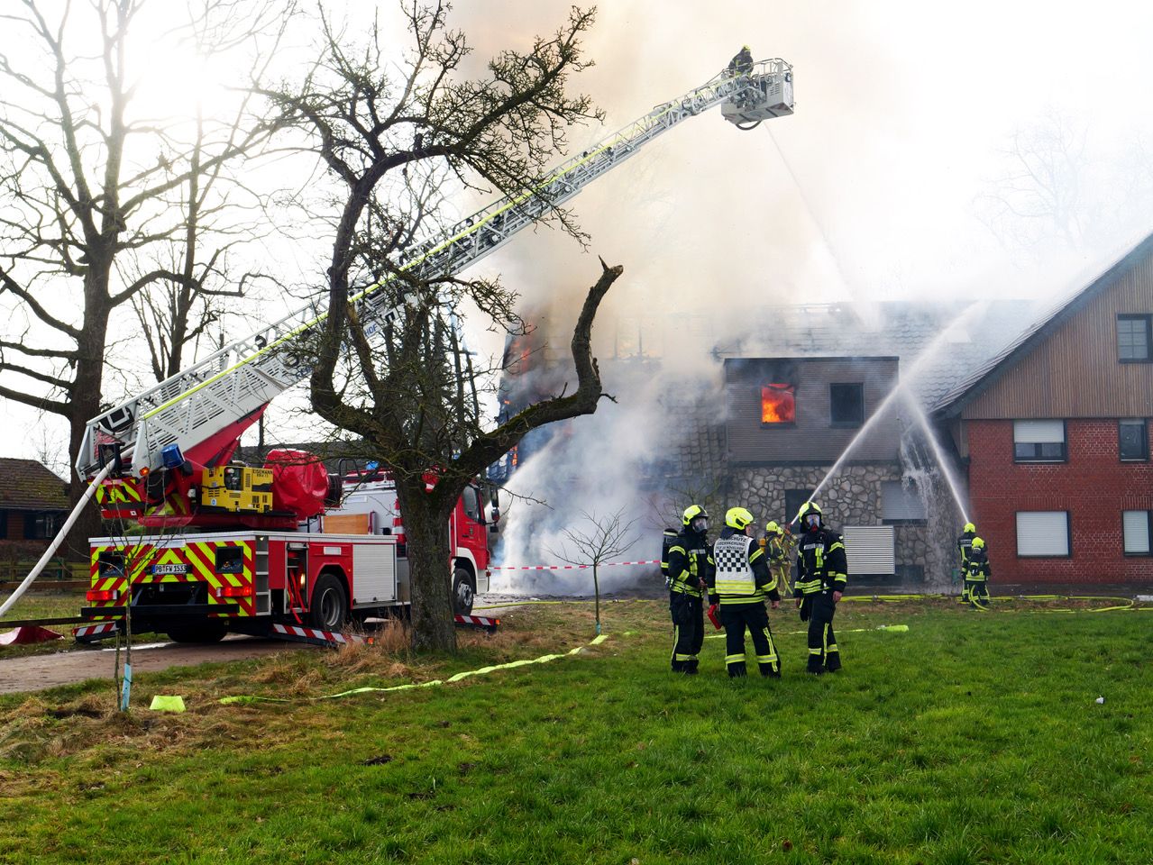 Zu einem Großeinsatz in Hövelhof sind am Freitagmorgen rund 110 Einsatzkräfte der Feuerwehren aus Hövelhof und Delbrück gerufen worden. An der Staumühler Straße brannten die Wohngebäude des ehemaligen Hofes Buschmeier, die in den vergangenen Jahren aufwendig saniert und in ein Ensemble vier Wohnungen in zwei Doppelhaushälften um- und ausgebaut worden waren.