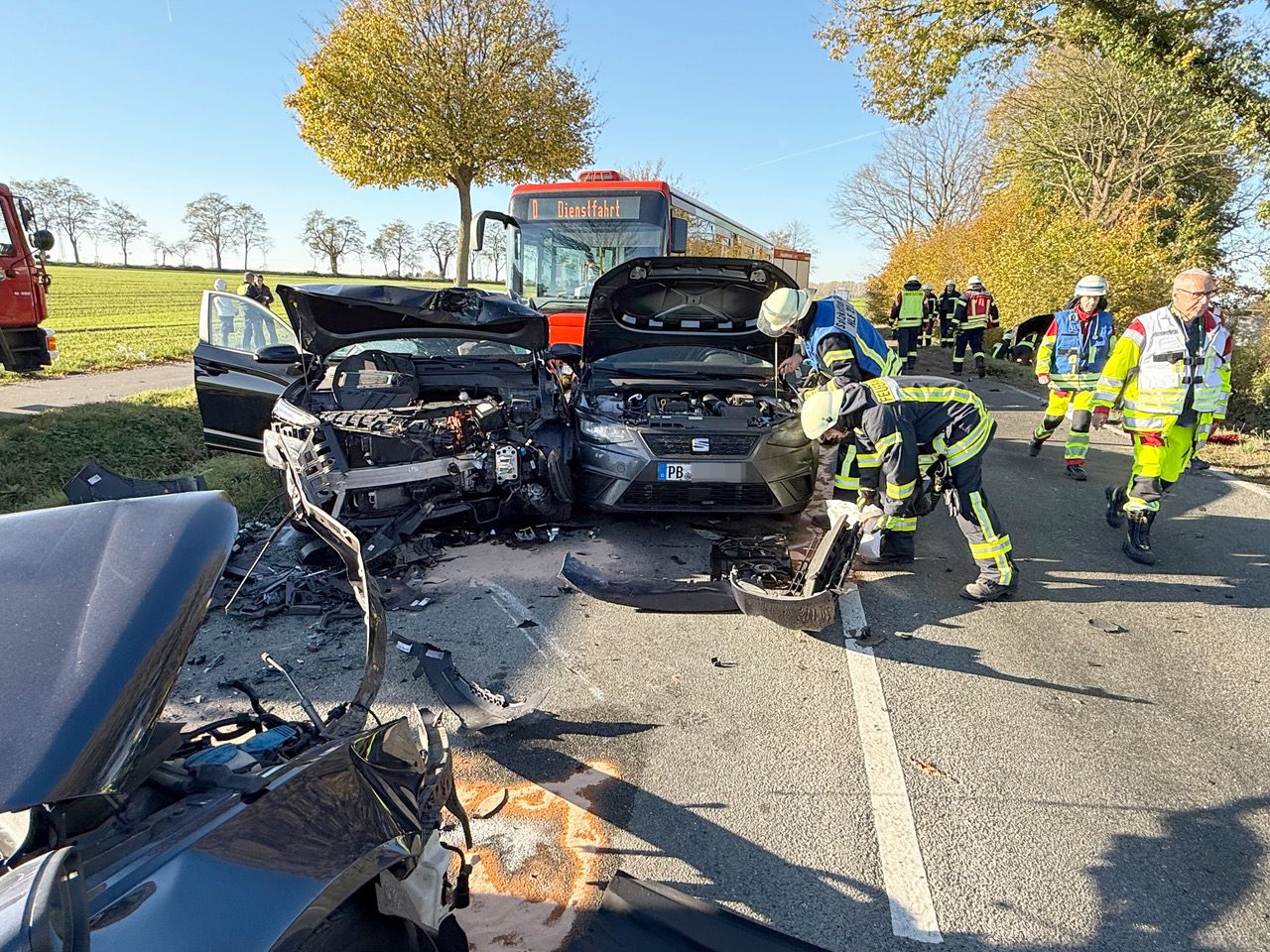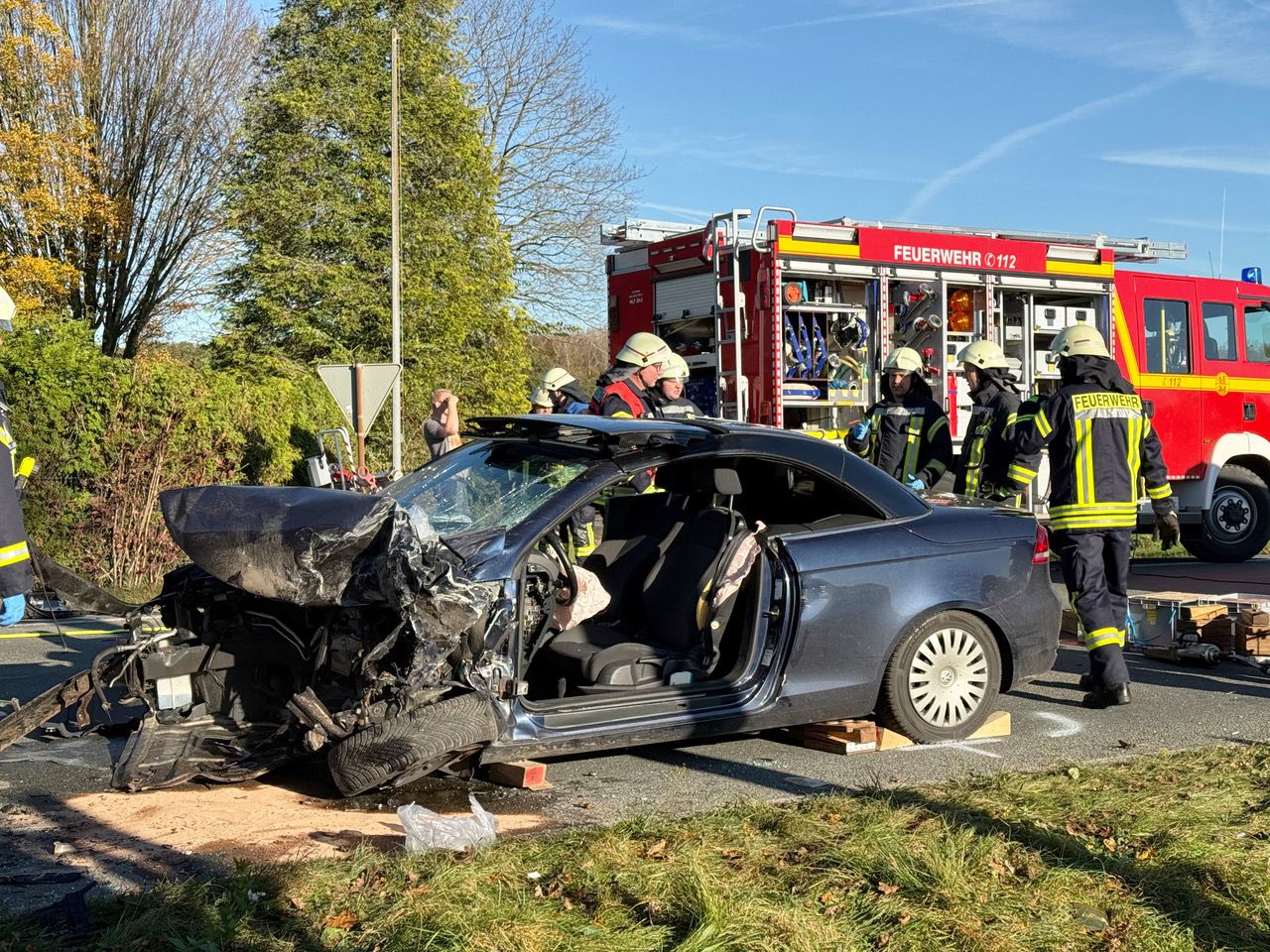 72-jährige Autofahrerin bei Alleinunfall in Delbrück schwer verletzt. Technische Rettung aus E-Auto erweist sich als sehr aufwendig,