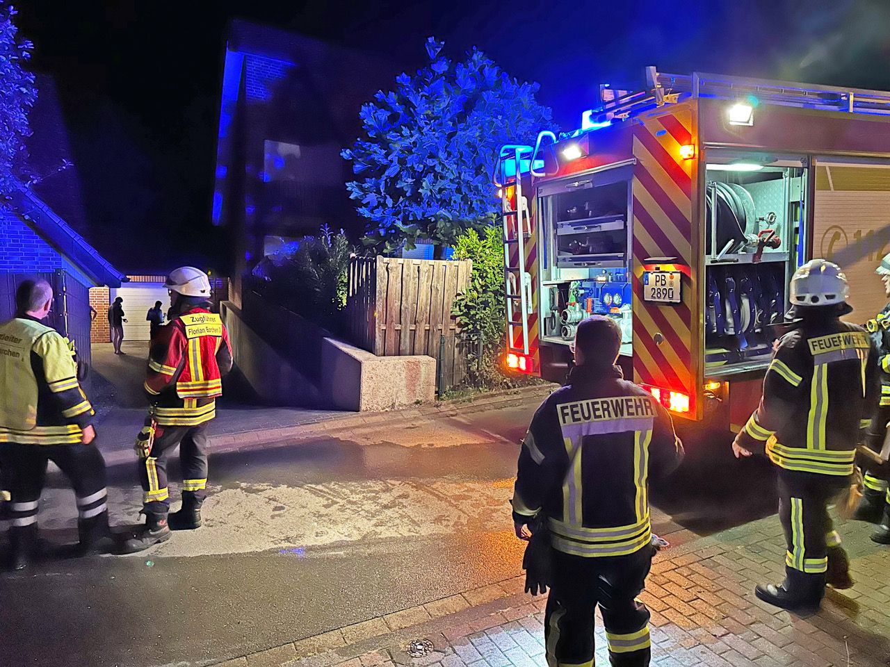 Vier brennende Mülltonnen in einer abschüssigen Garagenzufahrt zwischen zwei mehrgeschossigen Wohnhäusern am Ahornweg im Borchener Ortsteil Kirchborchen lösten am frühen Sonntagmorgen einen Einsatz der Feuerwehr Borchen aus.