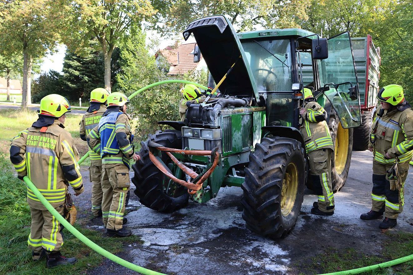 Trecker gerät in Delbrück in Brand: Feuerwehr lobt Verhalten des Fahrers. Zufällig vor Ort befindliche Polizei löscht mit Pulverlöscher.