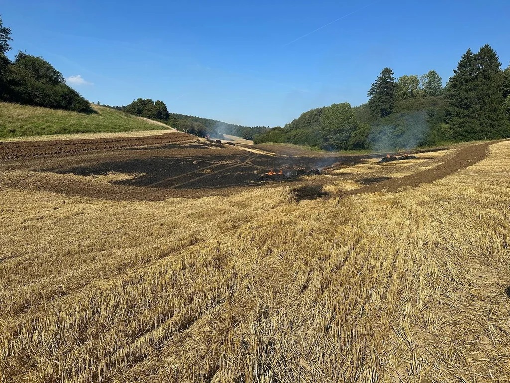 Strohballenpresse brennt auf Feld bei Büren-Brenken. Viel Arbeit für die Feuerwehr.