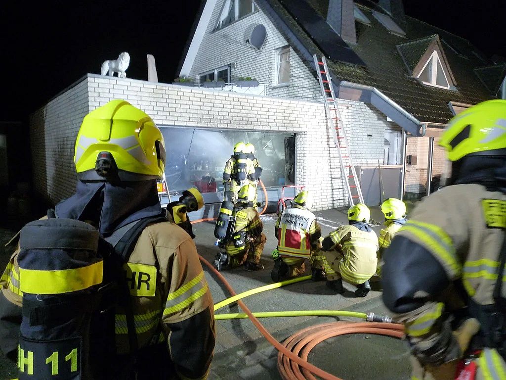 Feuerwehr löscht Garagenbrand in Paderborn-Benhausen. Als Ursache wird die Selbstentzündung von Lithium-Ionen-Akkus vermutet.