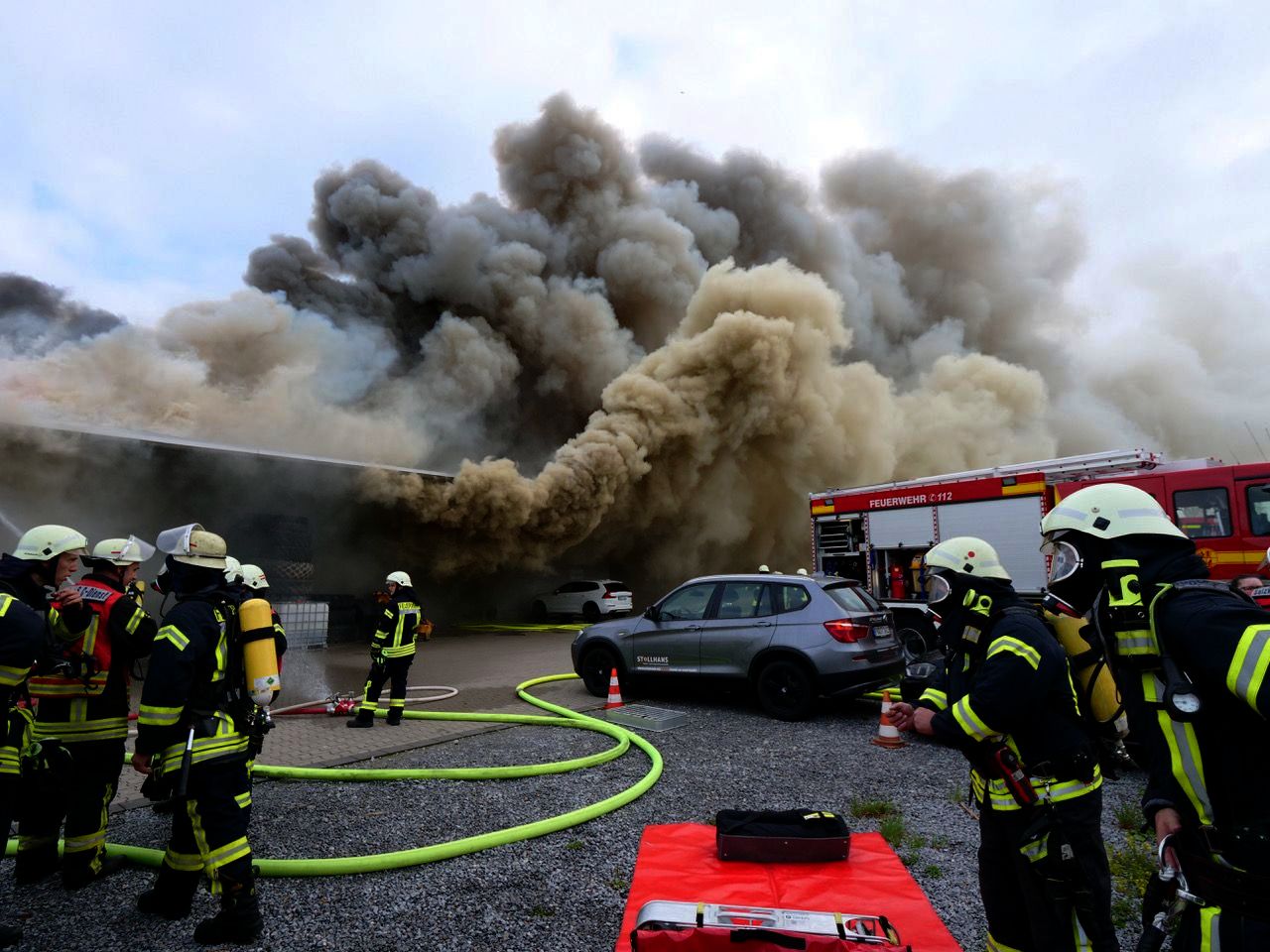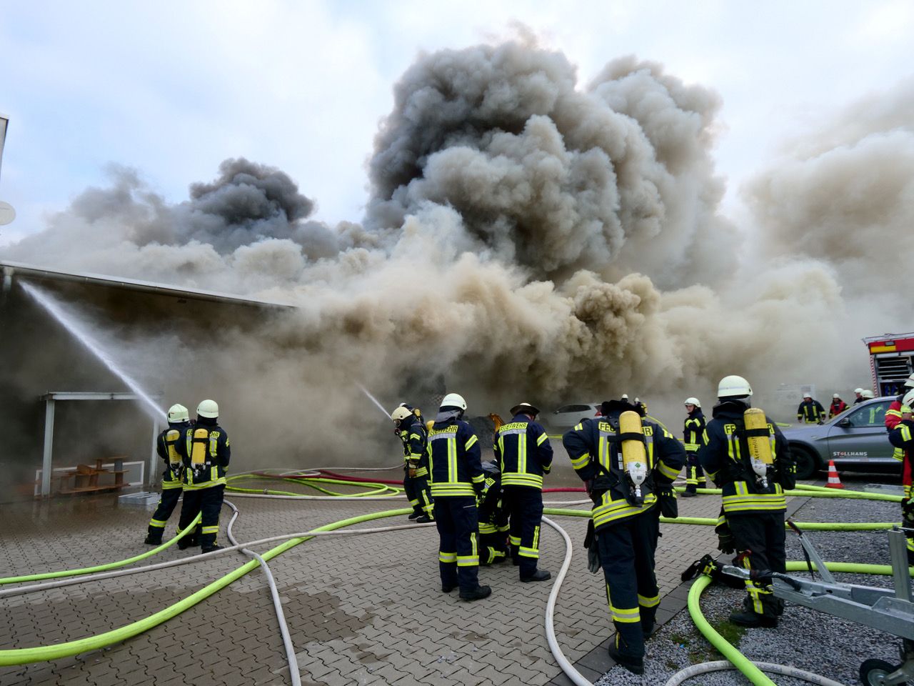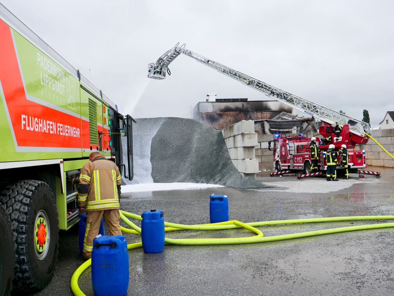 Mehr als 200 Feuerwehrleute aus Salzkotten, Büren, Delbrück und Paderborn waren am Freitag bei einem Großbrand im Gewerbegebiet Berglar in der Nähe der Bahnstrecke Paderborn-Hamm im Einsatz. Eine 1.200 Quadratmeter große Gewerbehalle in Mischnutzung wurde von den Flammen zerstört, berichtet Tobias Rupprecht, Leiter der Feuerwehr Salzkotten. Eine mehrere hundert Meter hohe Rauchwolke stand über dem Gewerbegebiet und zog mit dem Wind nordostwärts. Nach rund zweieinhalb Stunden waren die Flammen gelöscht, die Nachlöscharbeiten zogen sich aber noch bis in den späten Nachmittag hin.