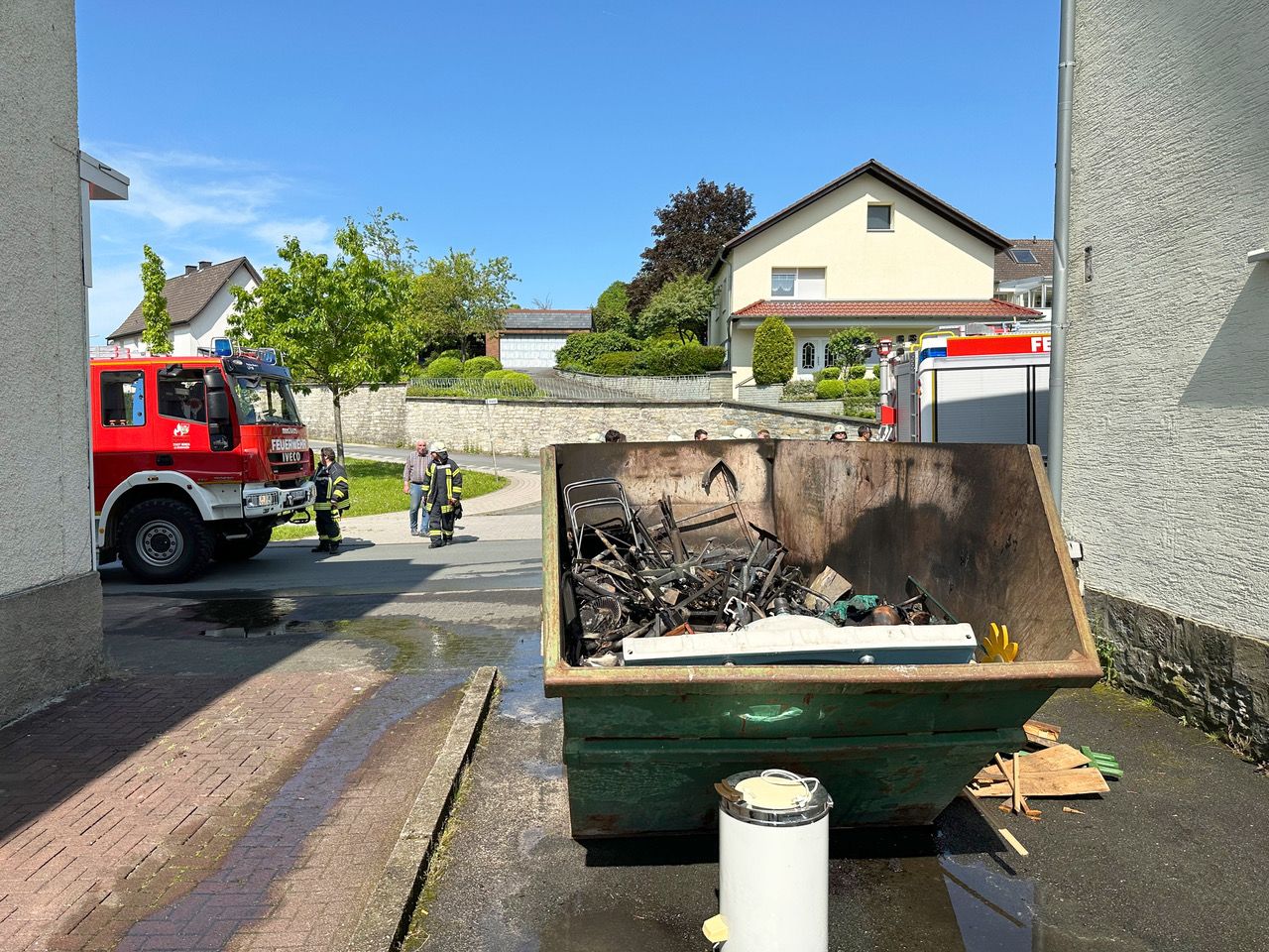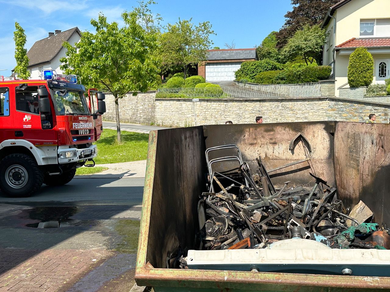 42 Feuerwehrleute der Bürener Feuerwehr haben am Samstagnachmittag einen brennenden Container an der Bürener Straße gelöscht. Im Inneren des Containers befanden sich ausgeglühte Metalltrümmer, Mobiliar und Einrichtungsgegenstände des früheren Friseursalons Dieter Vollmer.