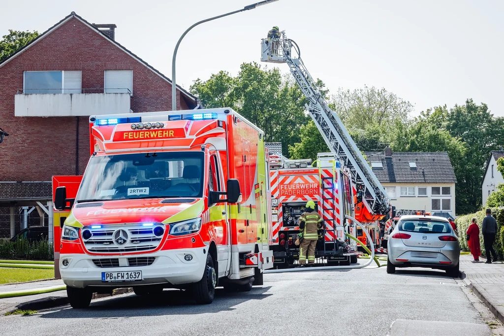 Balkonbrand in Paderborn endet glimpflich. Feuerwehr im Einsatz am Borkumer Weg.