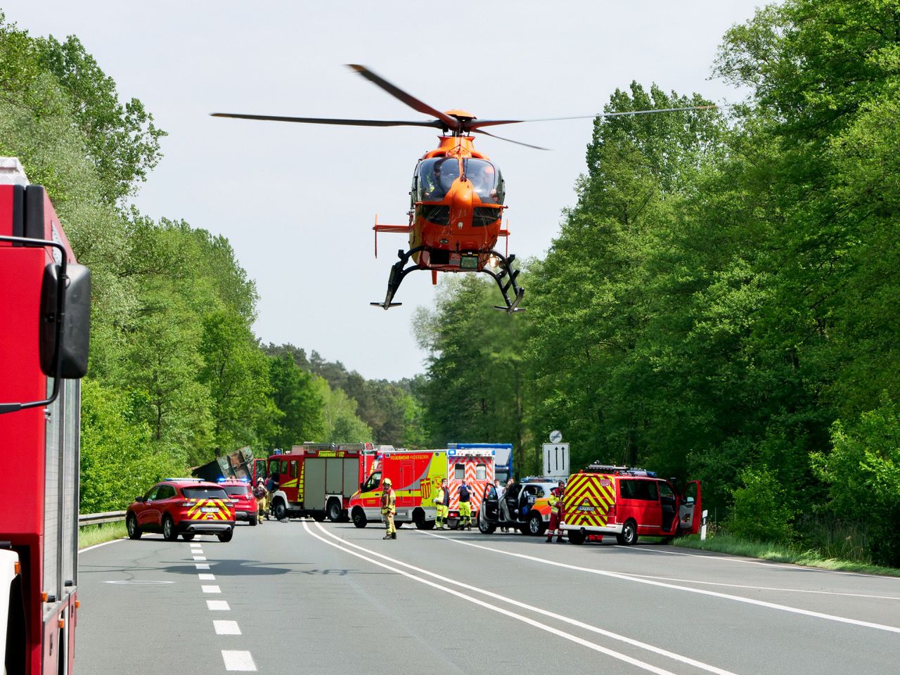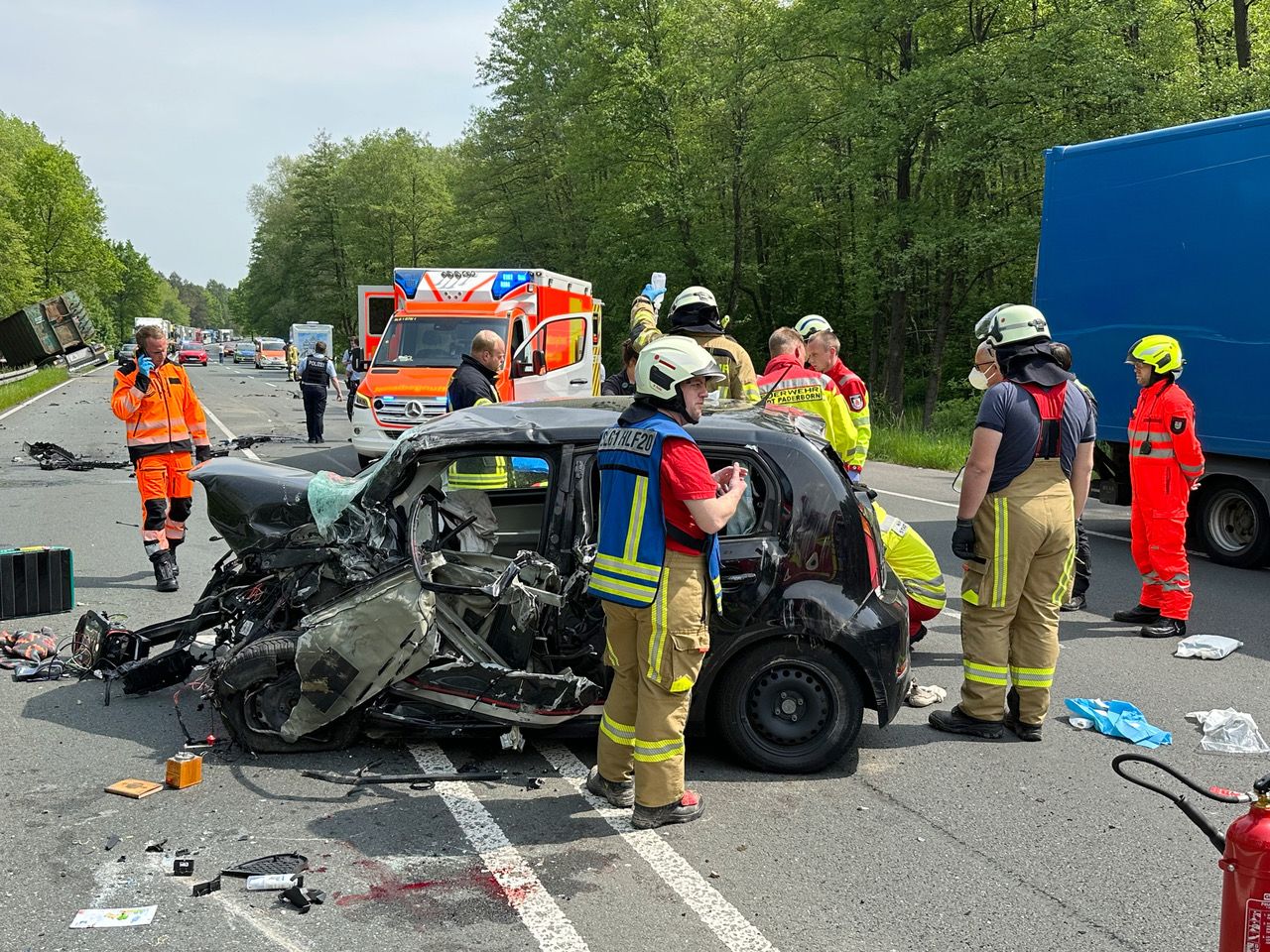Bei einem Frontalzusammenstoß auf der Bundesstraße zwischen einem Lastzug und einem VW Up schwebt der 31 Jahre alte VW-Fahrer in Lebensgefahr. Der Unfall ereignete sich am Montag kurz nach 11 Uhr auf der Bundesstraße 1 in Höhe der Anschlussstelle Schlangen.