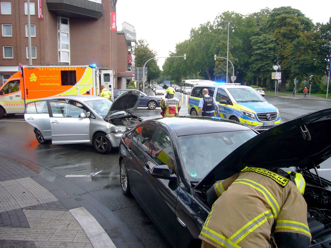 Mit drei Rettungswagen rückte die Feuerwehr Paderborn am frühen Freitagnachmittag zu einem Auffahrunfall am Neuhäuser Tor aus, an dem zwei Fahrzeuge mit insgesamt drei Insassen beteiligt waren.