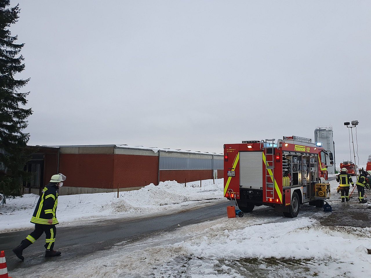 Seit den frühen Morgenstunden war die Feuerwehr Lichtenau im Gewerbegebiet „Zum Breikedahl" in der Nähe des Schulzentrums Lichtenau im Einsatz. Dort sind auf einer Fläche von rund 2.500 Quadratmetern Teile des Daches einer 5.000 Quadratmeter großen Lager- und Produktionshalle der Breikedahl GbR eingestürzt.